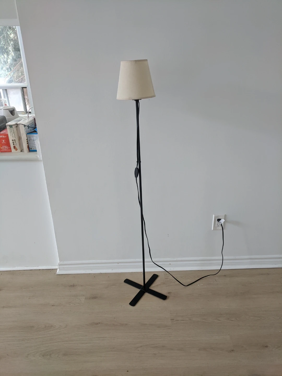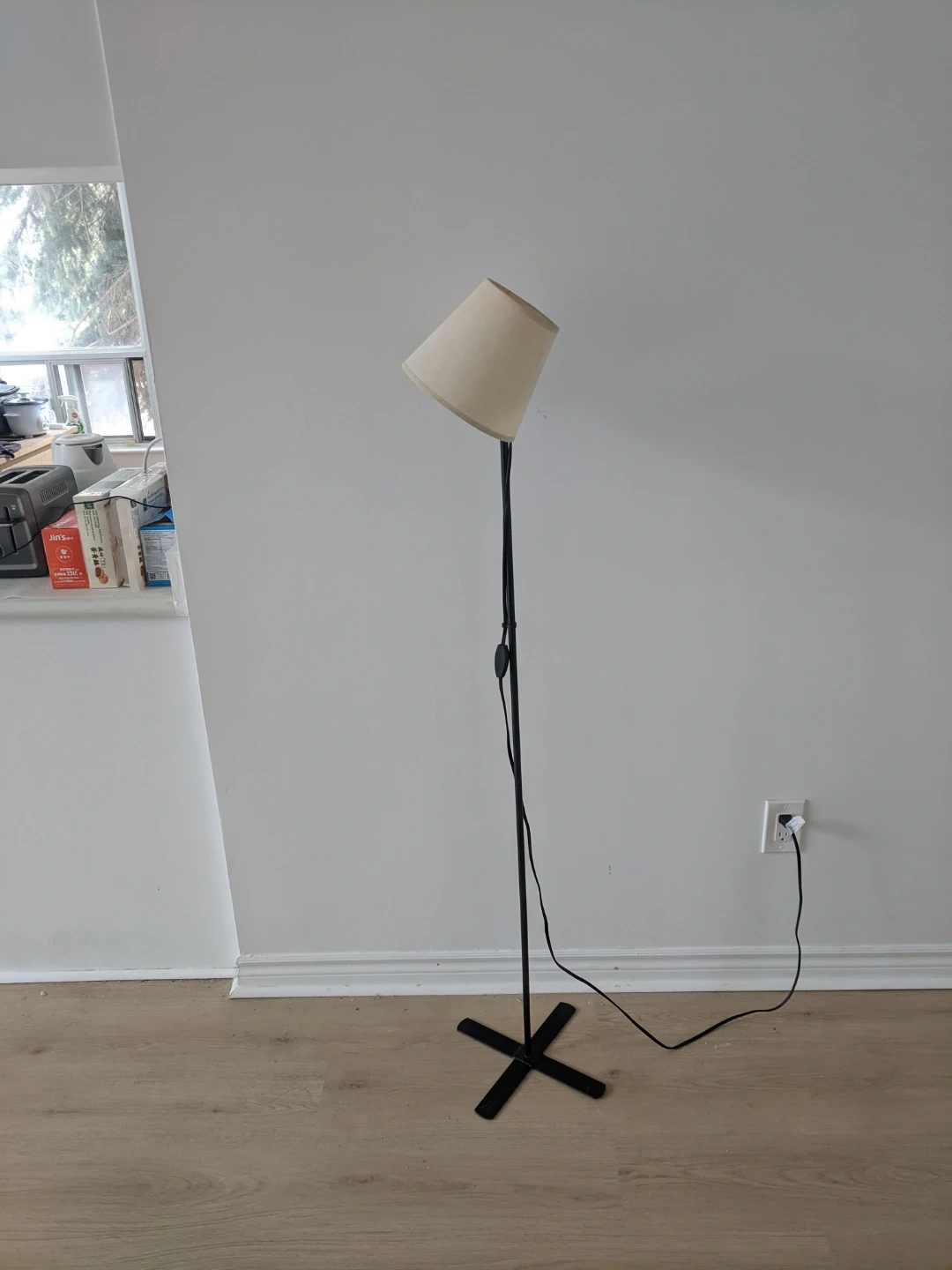 This IKEA BARLAST floor lamp provides convenient lighting. It's made in Romania. The lamp uses a standard bulb and has an inline power switch.