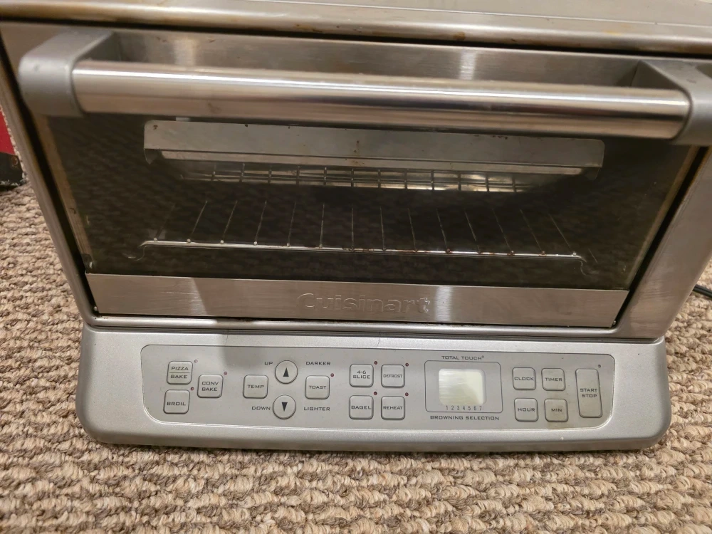Cuisinart toaster oven. It has a Total Touch control panel and several cooking functions like pizza bake, convection bake, toast, and broil. Perfect for small kitchens or quick meals!
