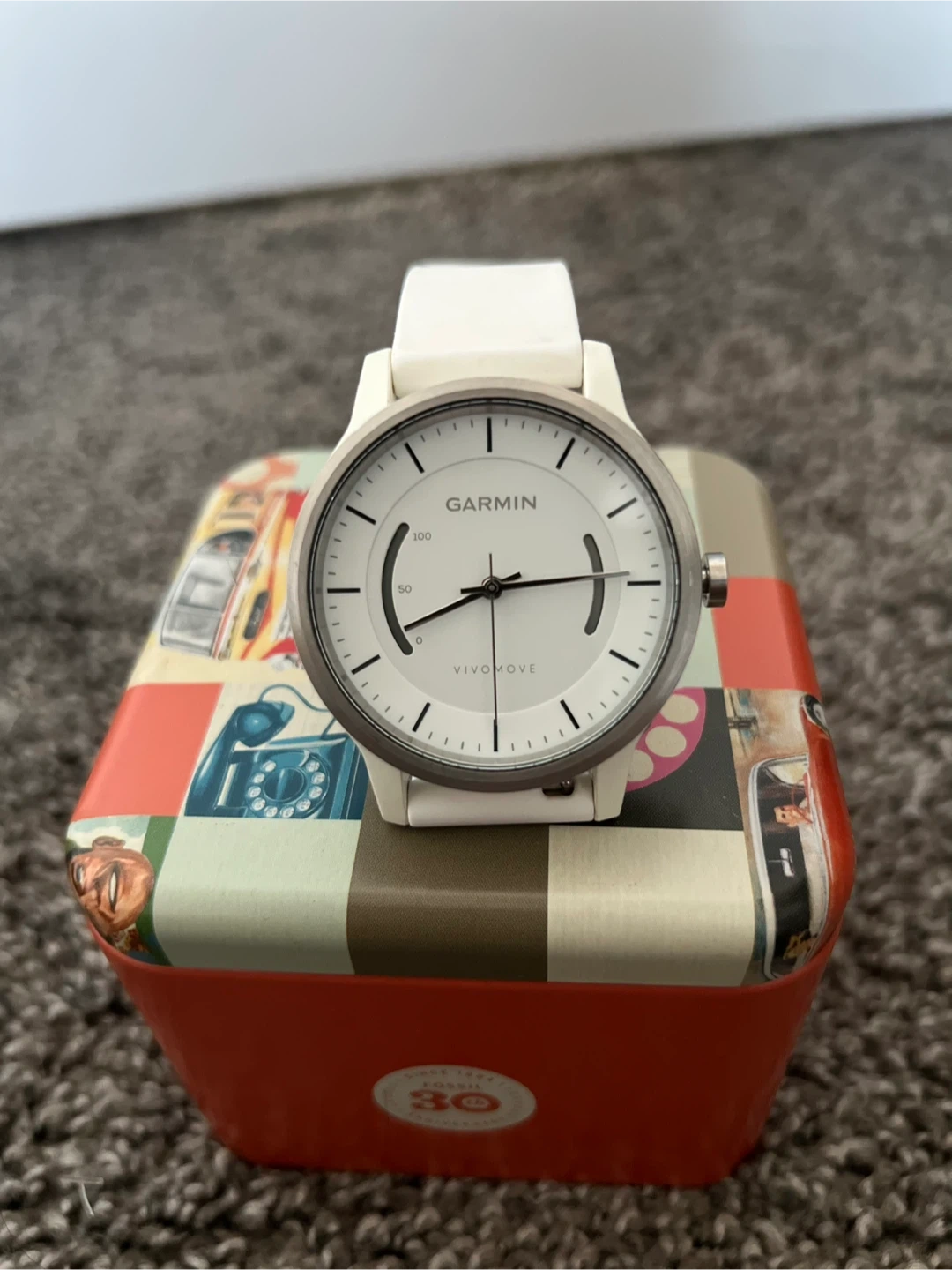 Selling a Garmin Vivomove hybrid smartwatch in white! It's in great condition.This stylish watch combines the classic look of an analog watch with smart features like step tracking and smartphone notifications. Perfect for everyday wear!