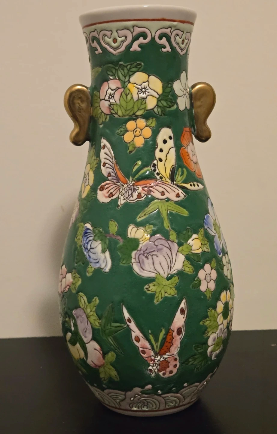 Vintage Mid Century Chinese Famille Rose Hand Painted Porcelain Vase With Butterfly and Floral Motifs On A Deep Green Ground. Excellent Condition, no chips or cracks. 8" Height.