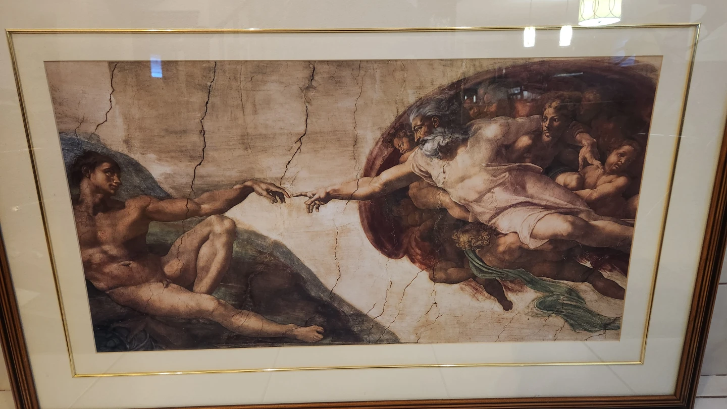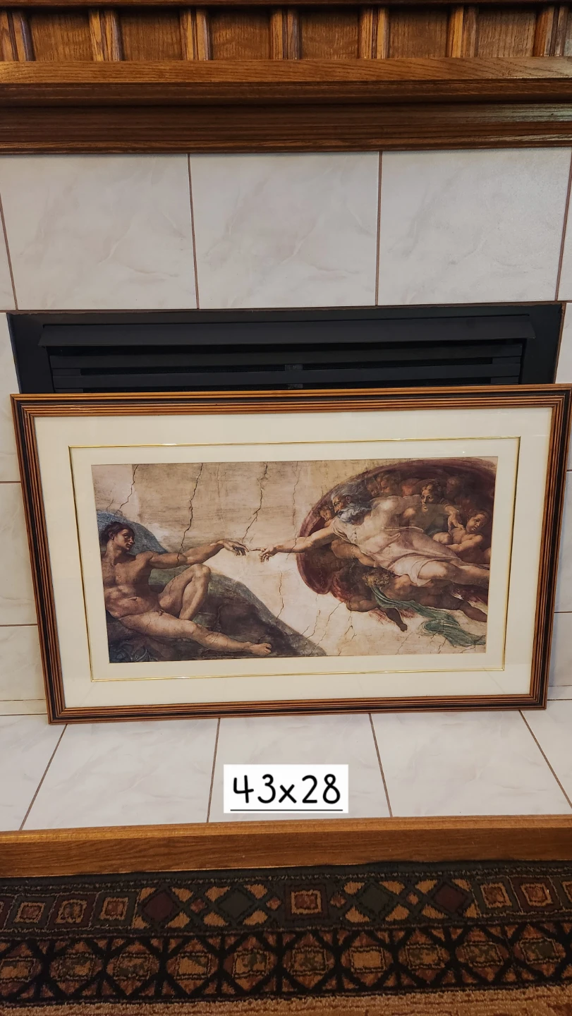 This framed print depicts Michelangelo's famous "The Creation of Adam" fresco. It measures 43x28 inches, including the frame. The artwork is beautifully presented with a golden mat and a wood-toned frame. This piece would make a great addition to any home or office décor!