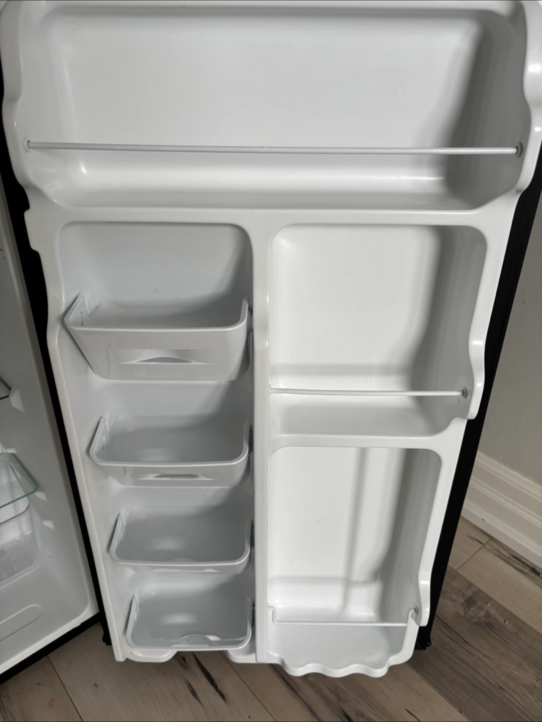Black mini fridge. Multiple shelves and door bins. Good for small spaces. Includes power cord.like new .Barely used .In a very good condition. Works perfectly noiselessly.