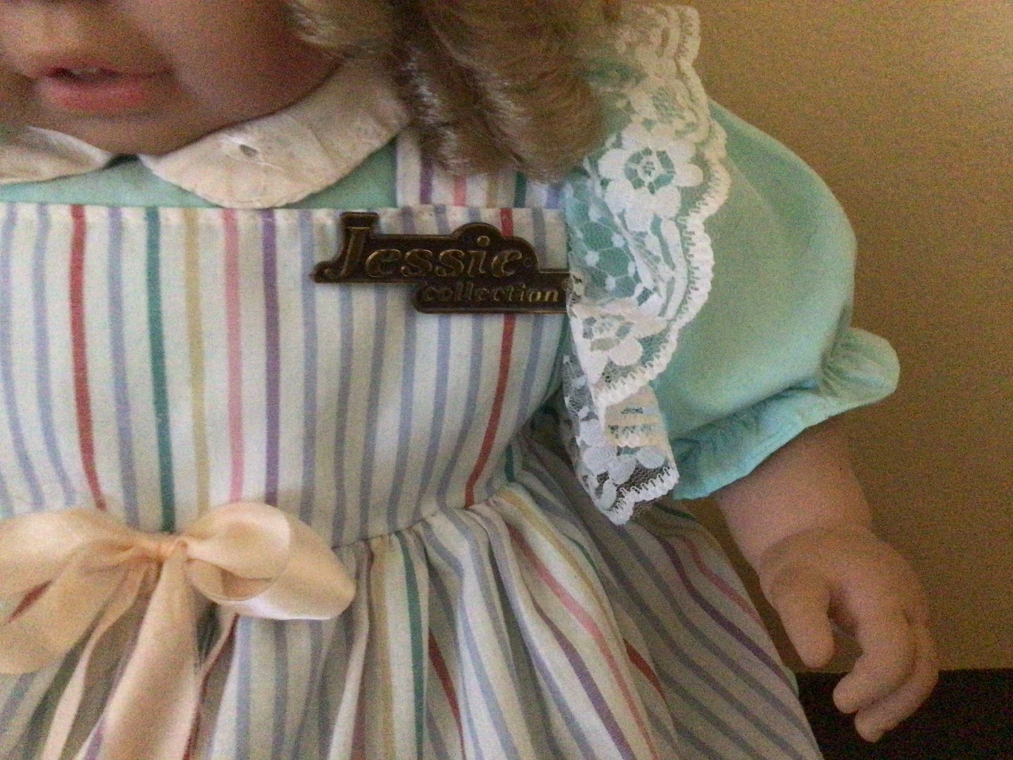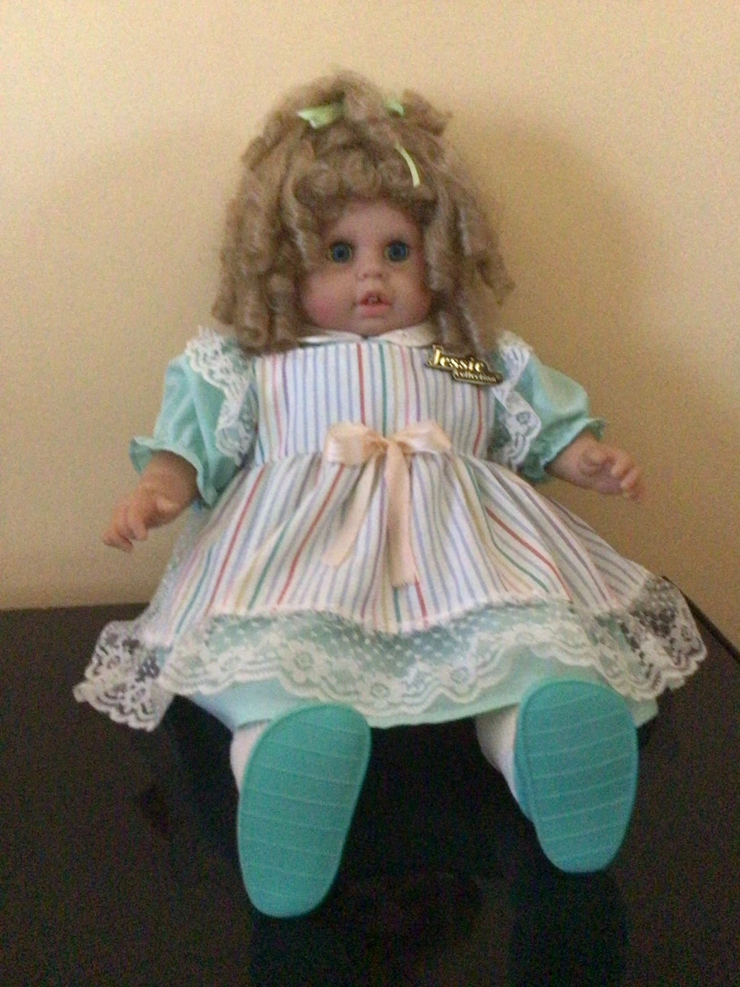A Jessie Collection doll with curly blonde hair and blue eyes. It's wearing a dress with colourful vertical stripes, a white lace collar and cuffs, and a pale pink bow. This doll is approximately 18 inches tall.
