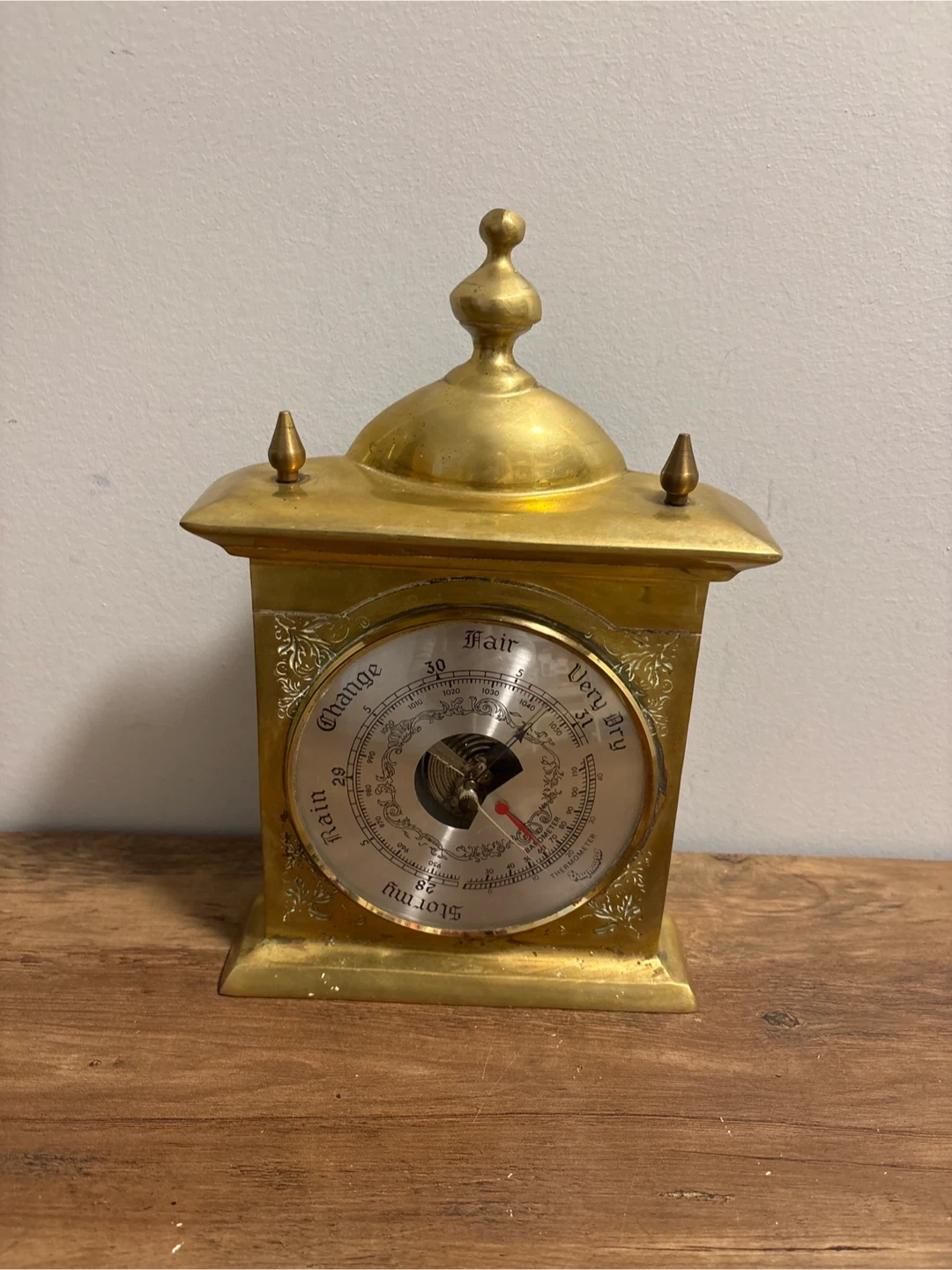 This is a brass barometer . It has a decorative design and indicates weather changes. It's a classic piece for any home!