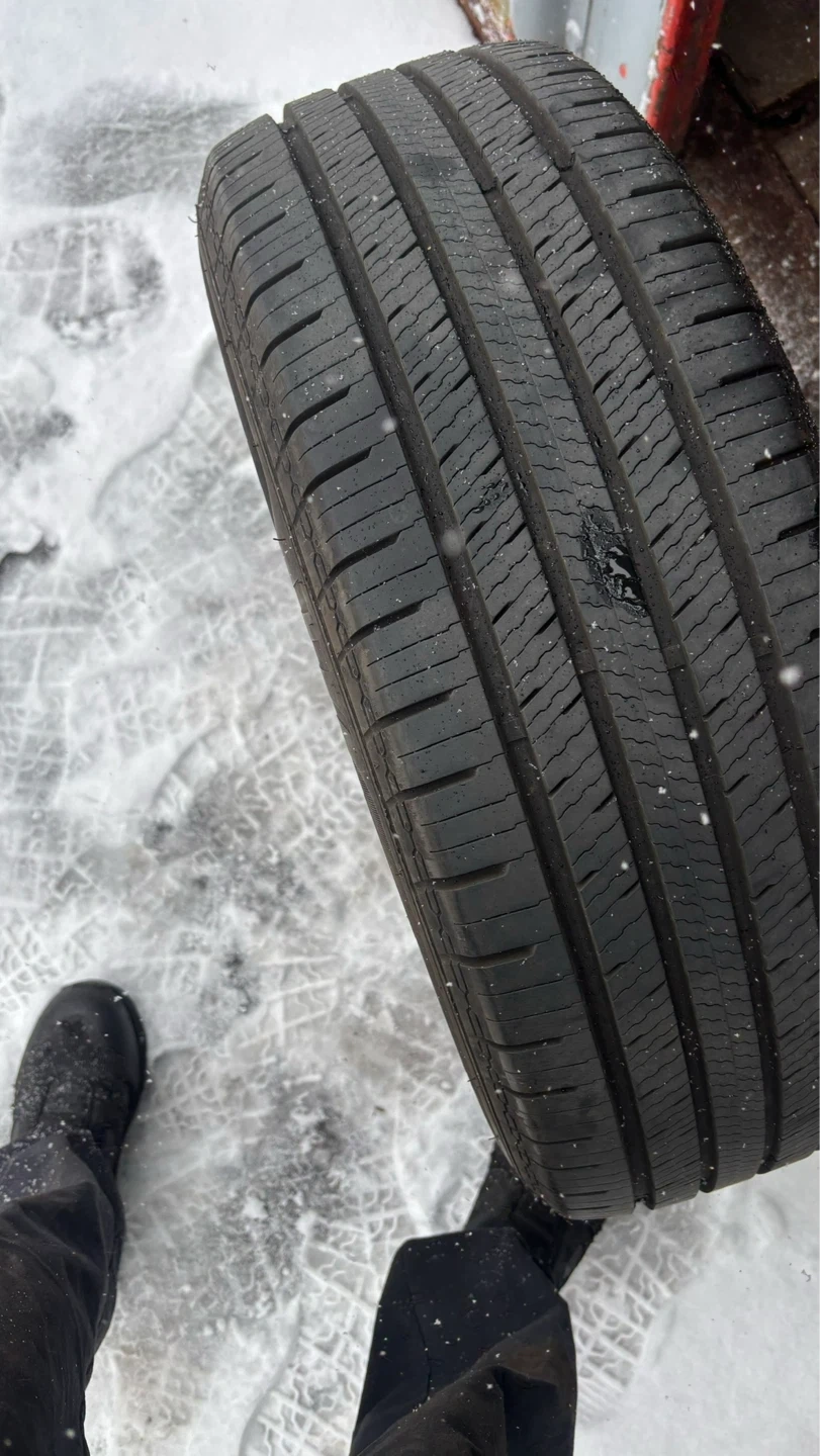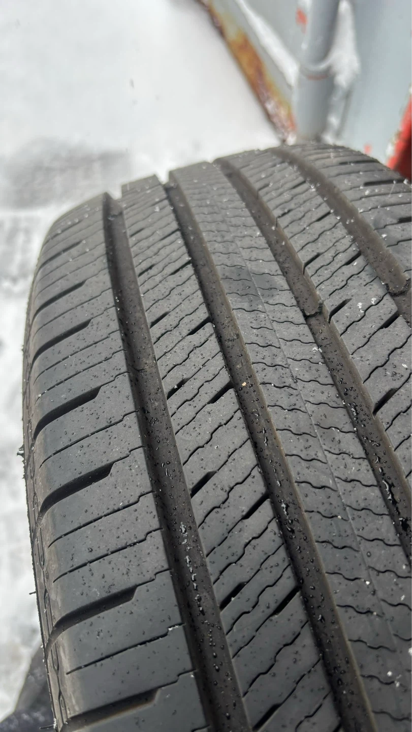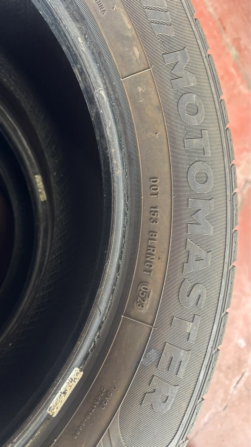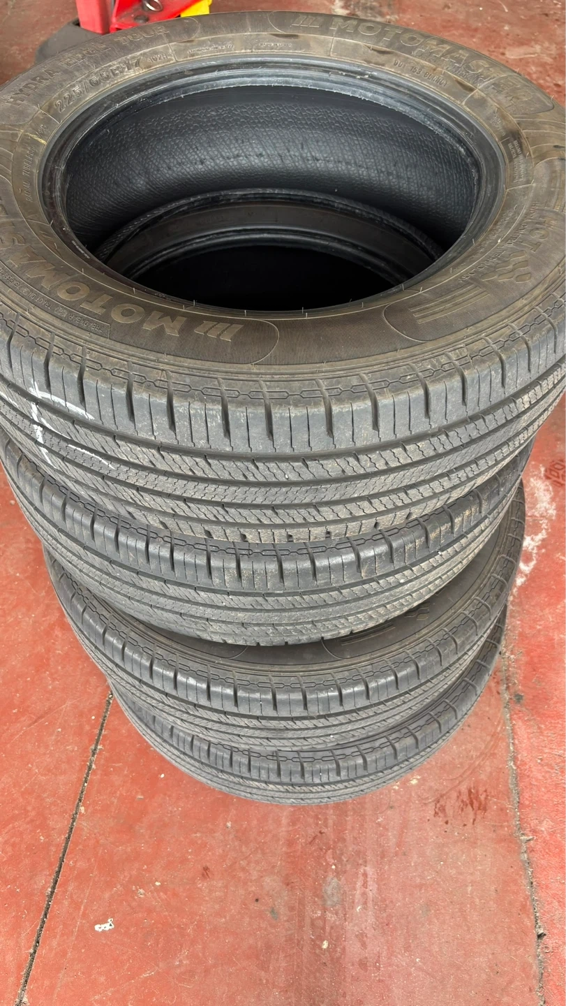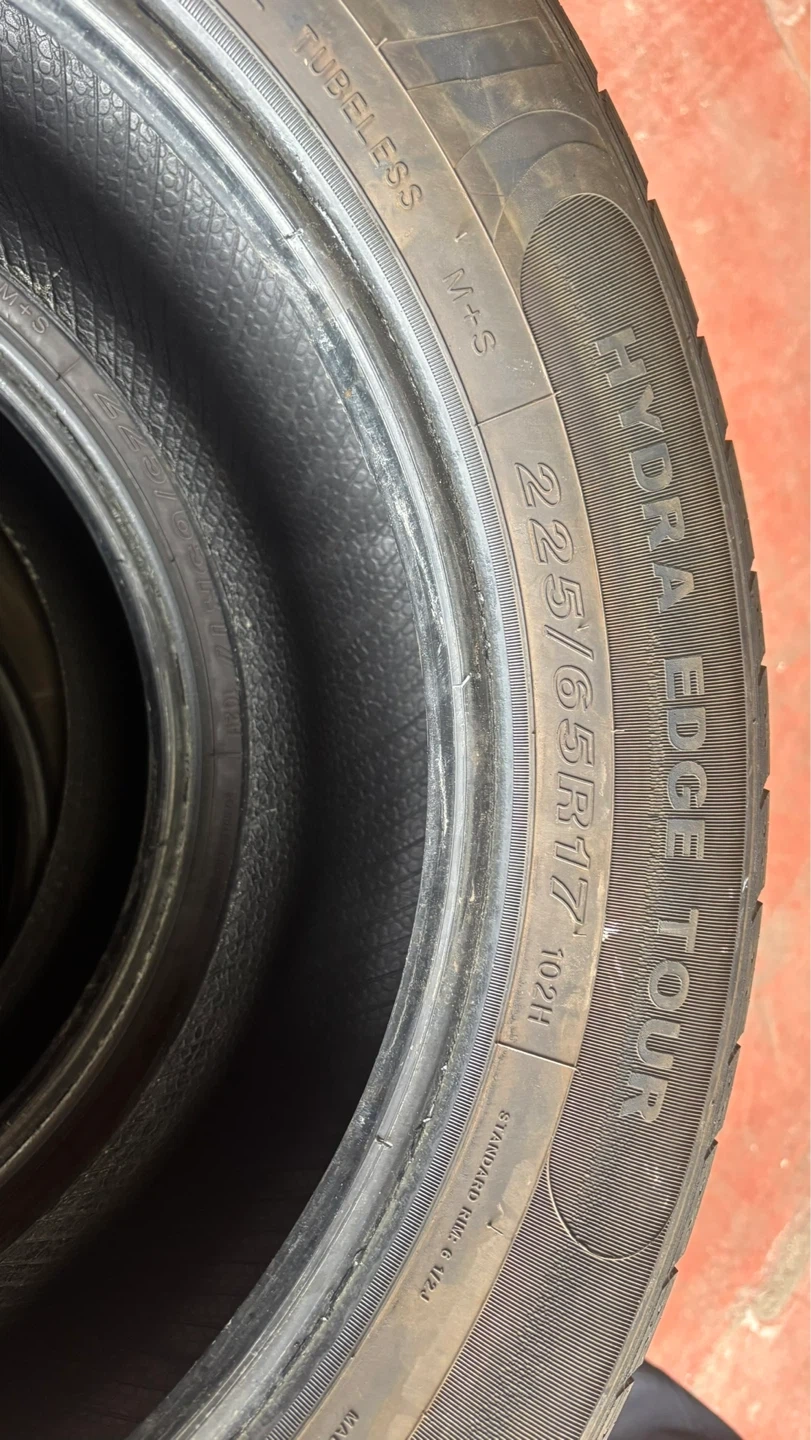 Set of four Motomaster Hydra Edge Tour tires. Size is 225/65R17. DOT code indicates manufacturing in the 25th week of 2023. All season tires with no rims