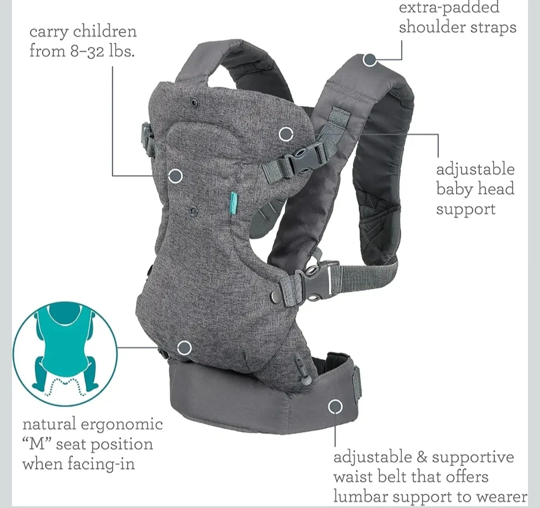Selling our Infantino Flip Advanced 4-in-1 Baby Carrier in gray – super comfortable, ergonomic, and perfect from newborn to toddler (8–32 lbs).