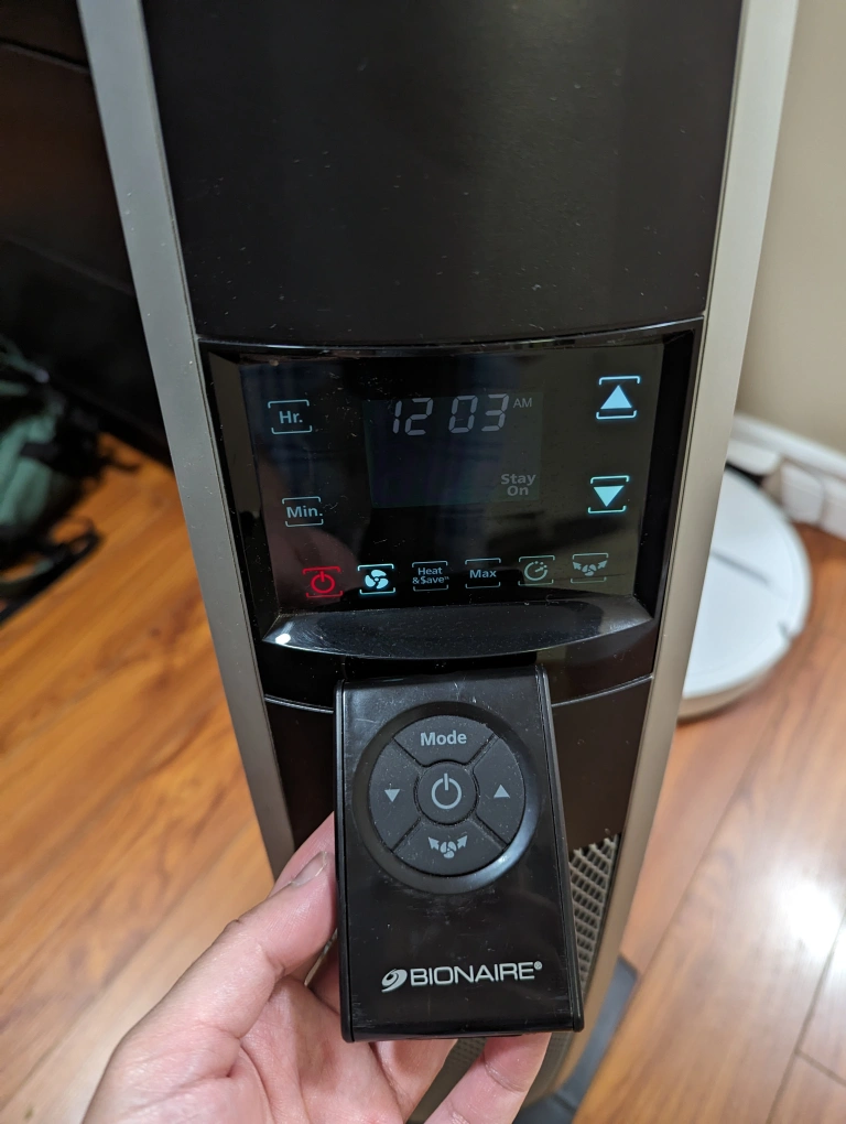 Portable heater by Bionaire, 30 inches tall. Remote control included to adjust the temperature. Has an oscillating side to side feature. In great working condition.