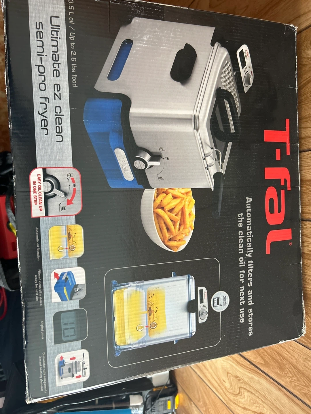 This is the T-fal Ultimate EZ Clean Semi-Pro Fryer. It automatically filters and stores clean oil for next use. Features a digital timer and a capacity of up to 2.5 lbs of food.