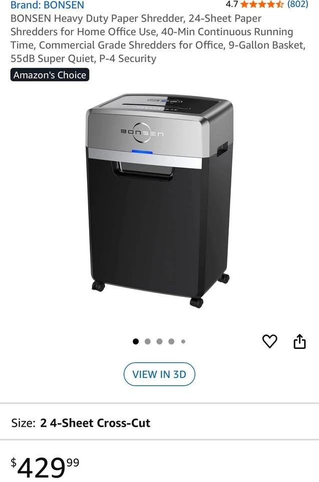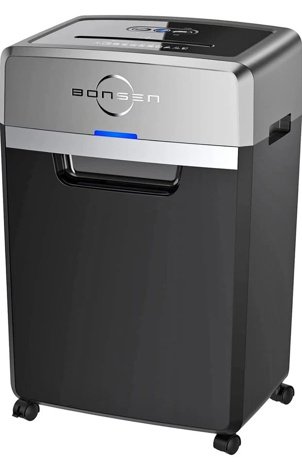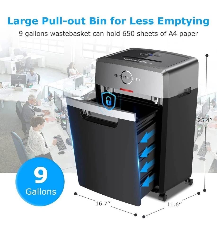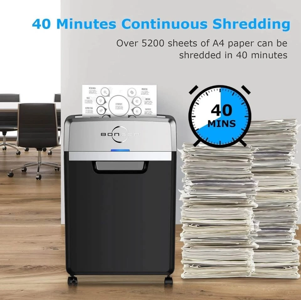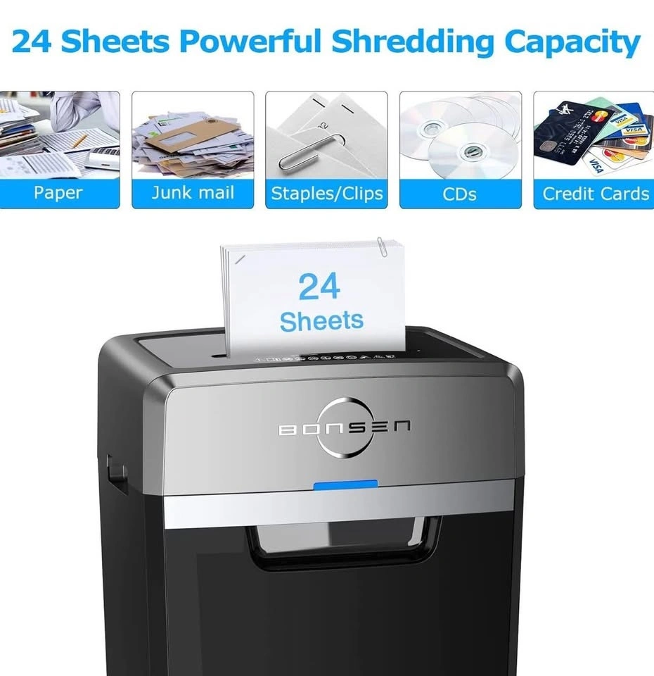 BONSEN heavy-duty paper shredder in like-new condition, in its original packaging. Handles up to 24 sheets at once with a 40-minute continuous run time. Features a 9-gallon bin and 55dB super quiet operation. P-4 security level for safe document shredding. Perfect for home or office use.