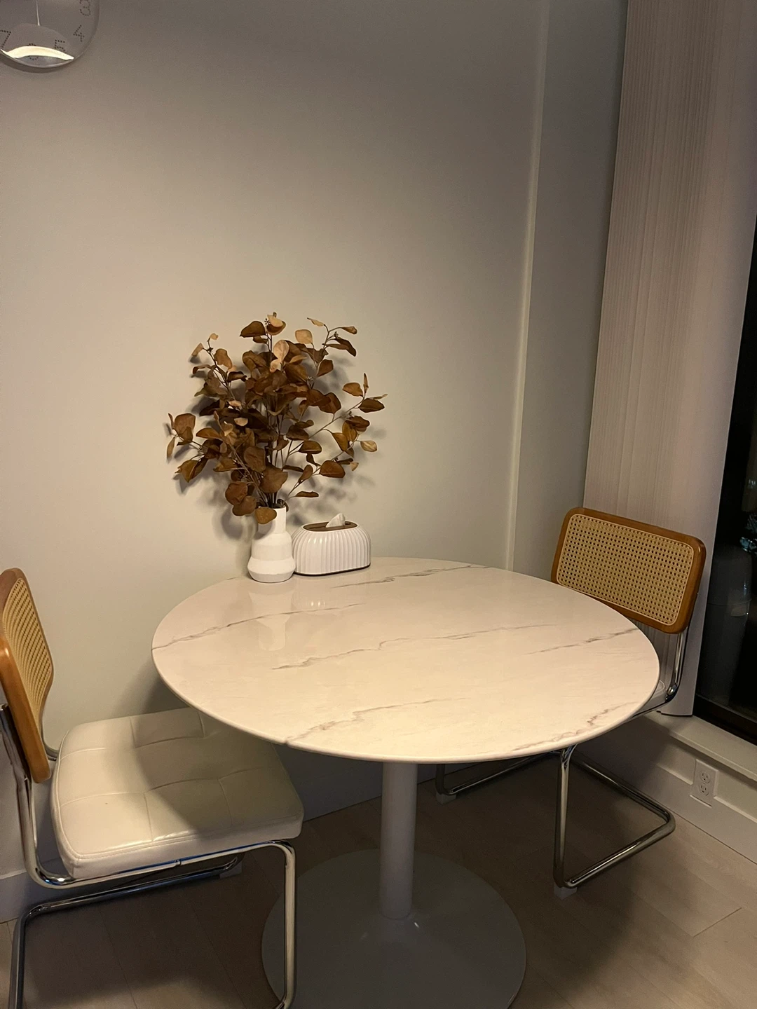Selling a round dining table with a marble-like top, perfect for a small space! It comes with two chairs that have a sleek, modern design with rattan backs and white cushioned seats. This set would be a great addition to any kitchen or dining area