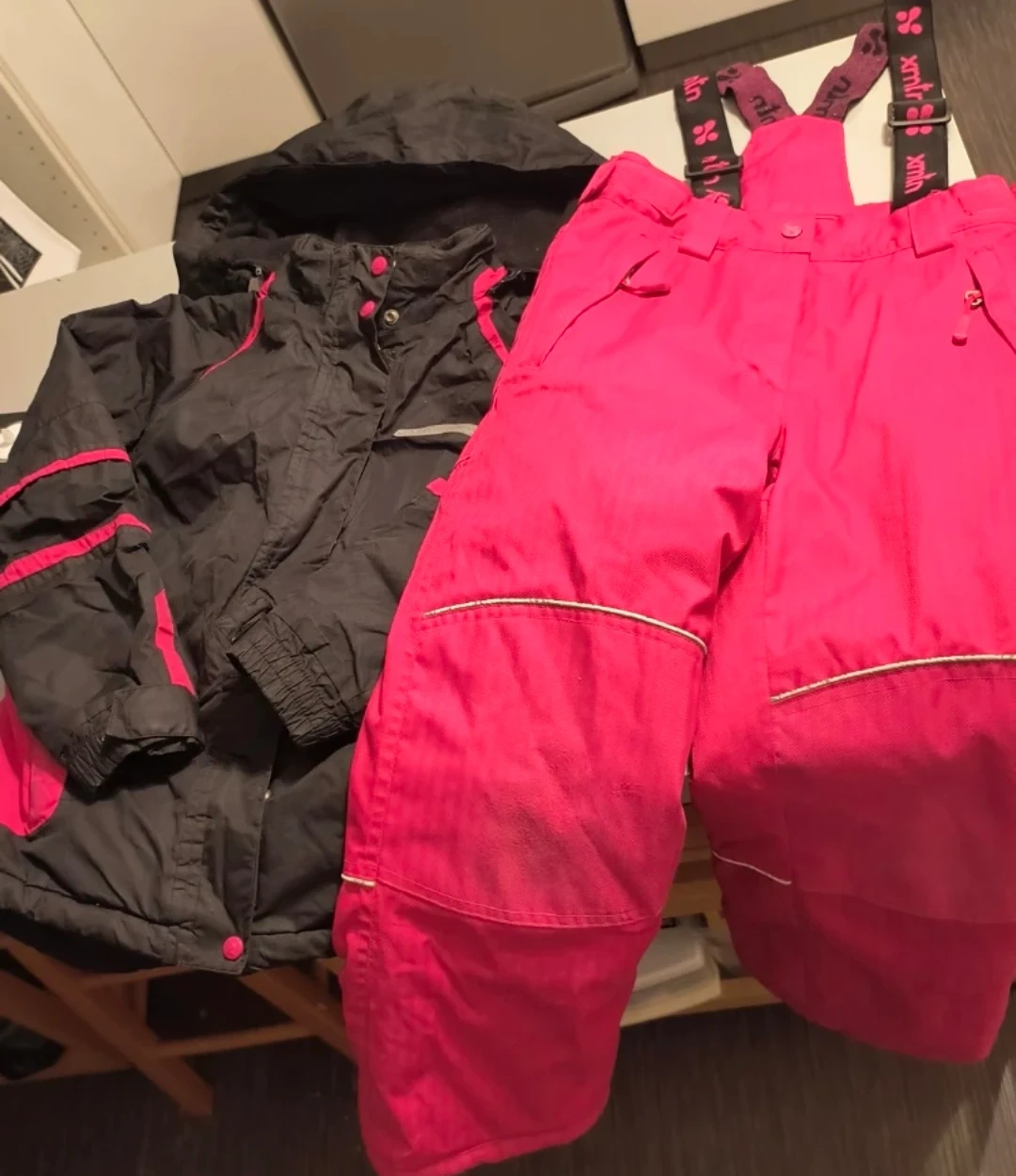 This girls' winter set includes a black and pink insulated jacket and matching snow pants. The jacket has a faux-fur trimmed hood and reflective accents. The snow pants are bright pink with adjustable suspenders. Perfect for keeping warm during winter activities!