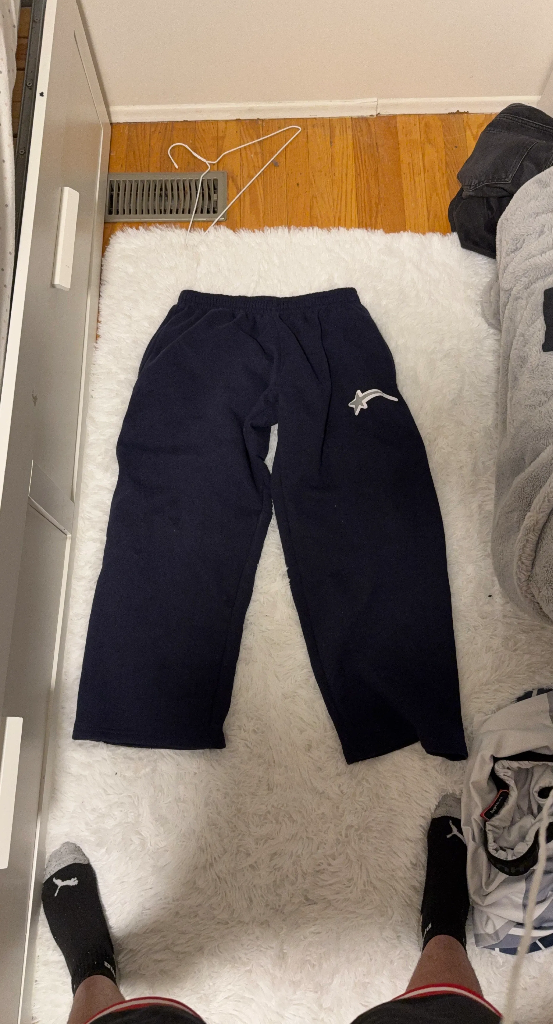 Comfortable navy blue joggers featuring a white star logo on the left thigh. These pants are made for casual wear. Elastic waistband and cuffs.