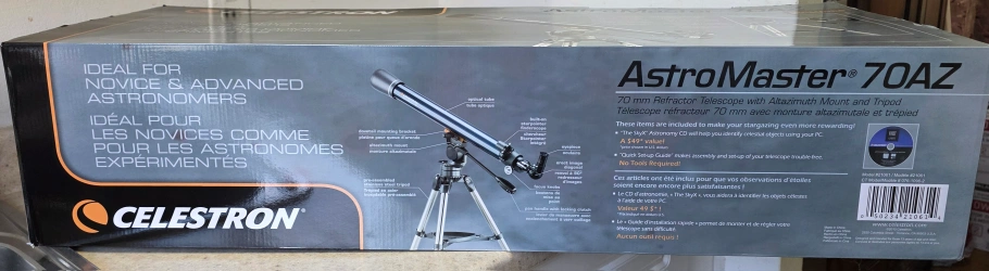 Looking to explore the night sky? I'm selling a Celestron AstroMaster 70AZ telescope that's in excellent condition! This 70mm refractor telescope comes with an altazimuth mount and tripod. It's perfect for both novice and advanced astronomers. The box is included!