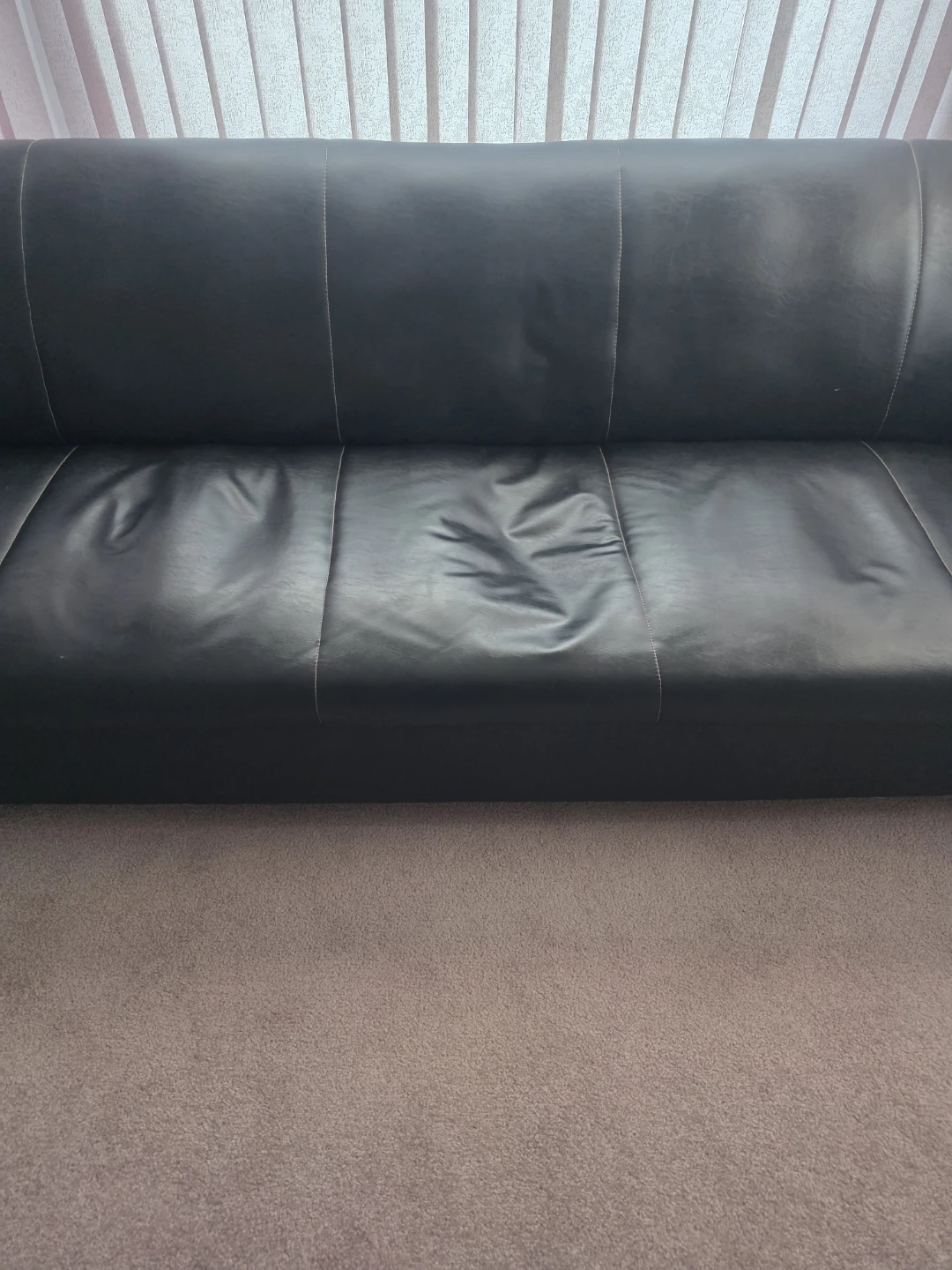 Classic black leather-look sofa in great condition. Well cared for, with no rips. Has a slight indent. Comfortable, sturdy, and timeless in design. From a clean, no pets, and smoke-free home.