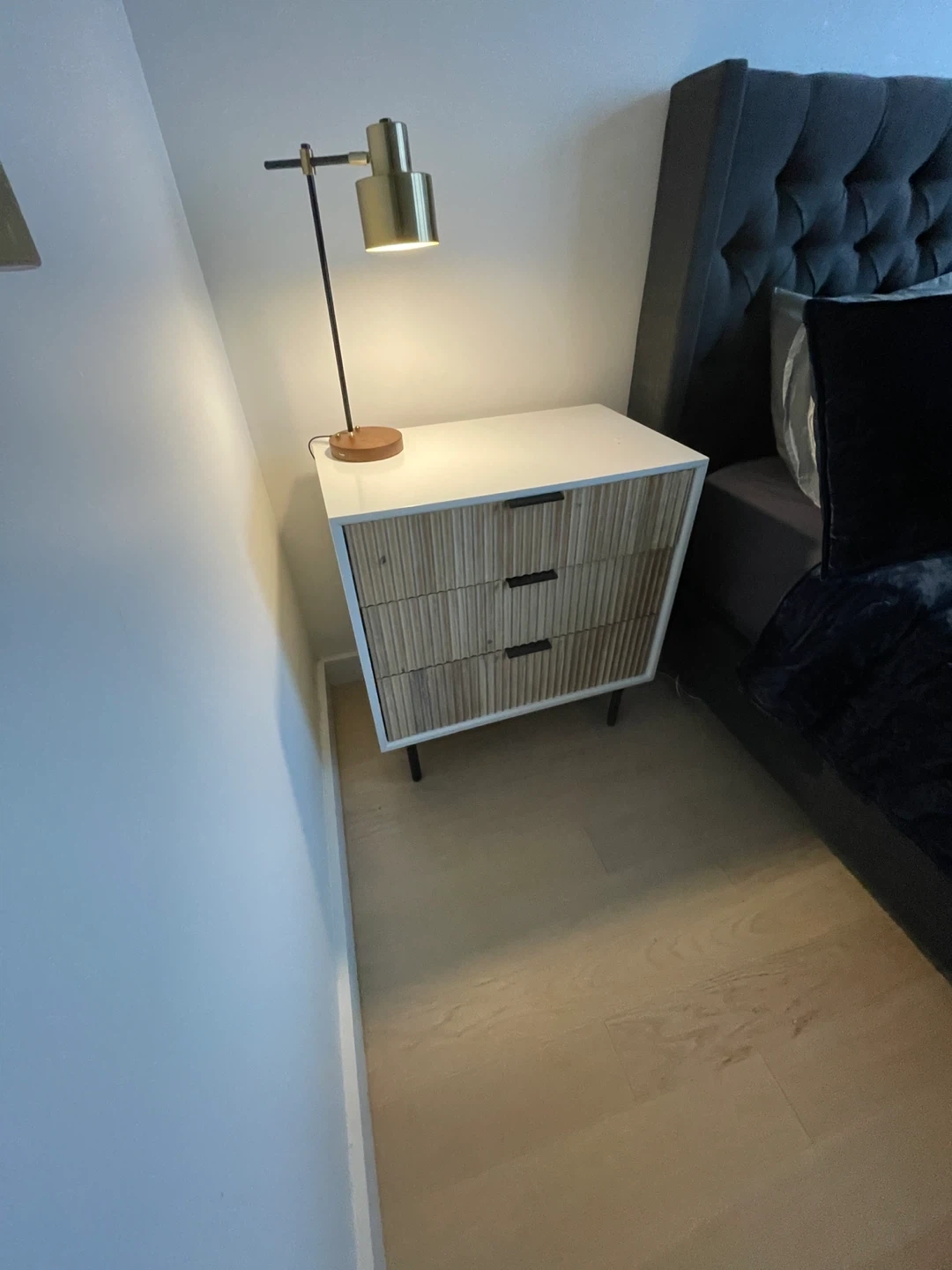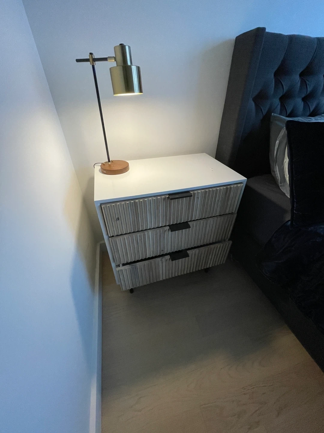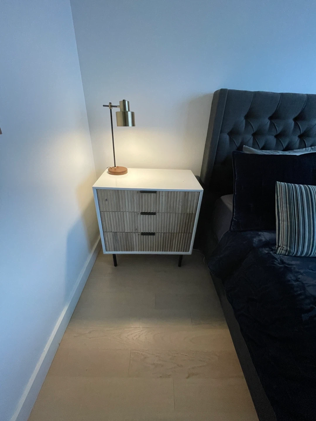 Selling a stylish white and wood nightstand! It's in good condition , just mild snatch but easy to repair and would look great in any bedroom. It features a clean white top with wood drawers. Perfect for storing your nighttime essentials