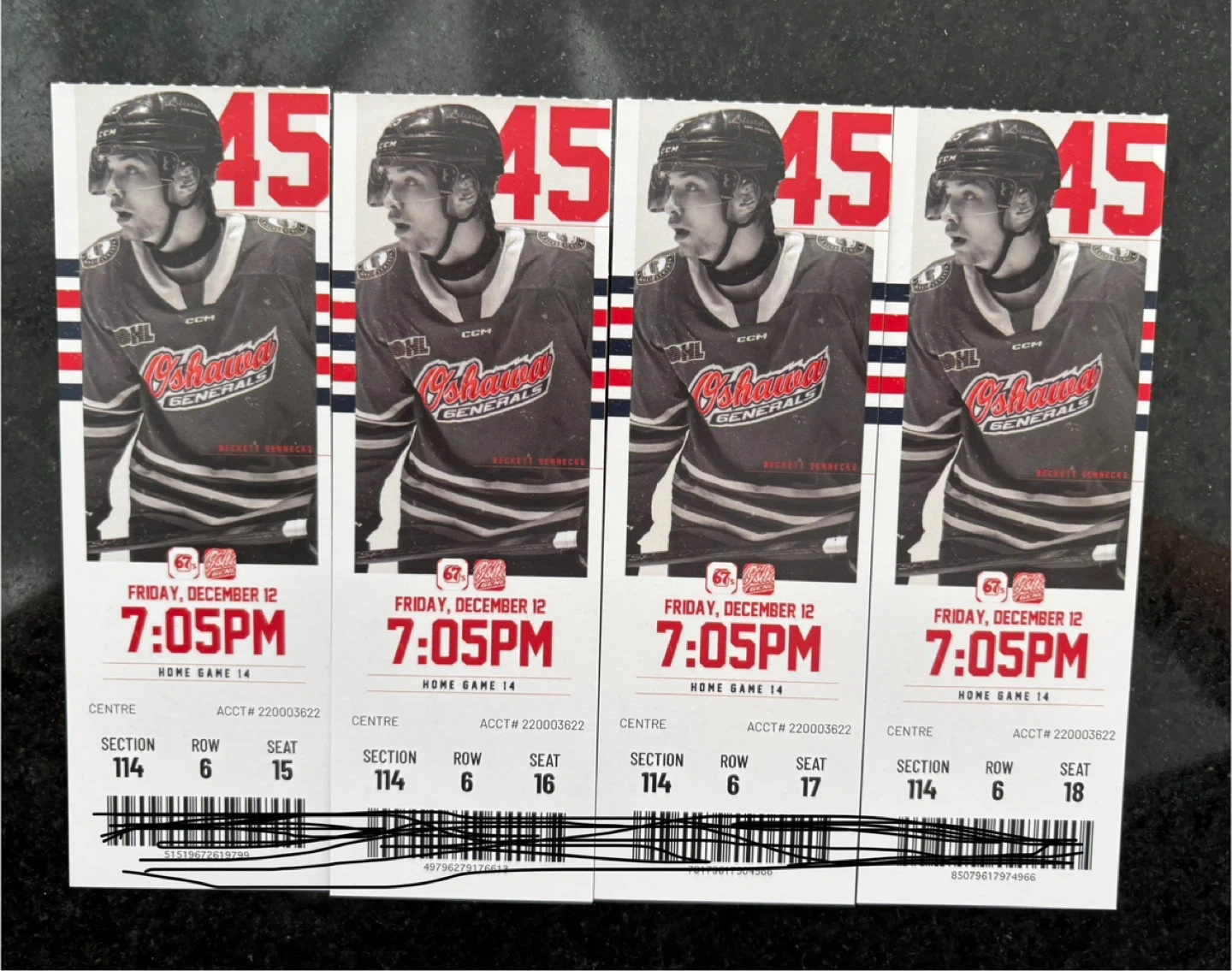 10Selling four tickets to see the Oshawa Generals play on Friday, December 12 at 7:05 PM. Seats are located in Section 114, Row 6, Seats 15-18. Come cheer on your favourite team! Parking included.