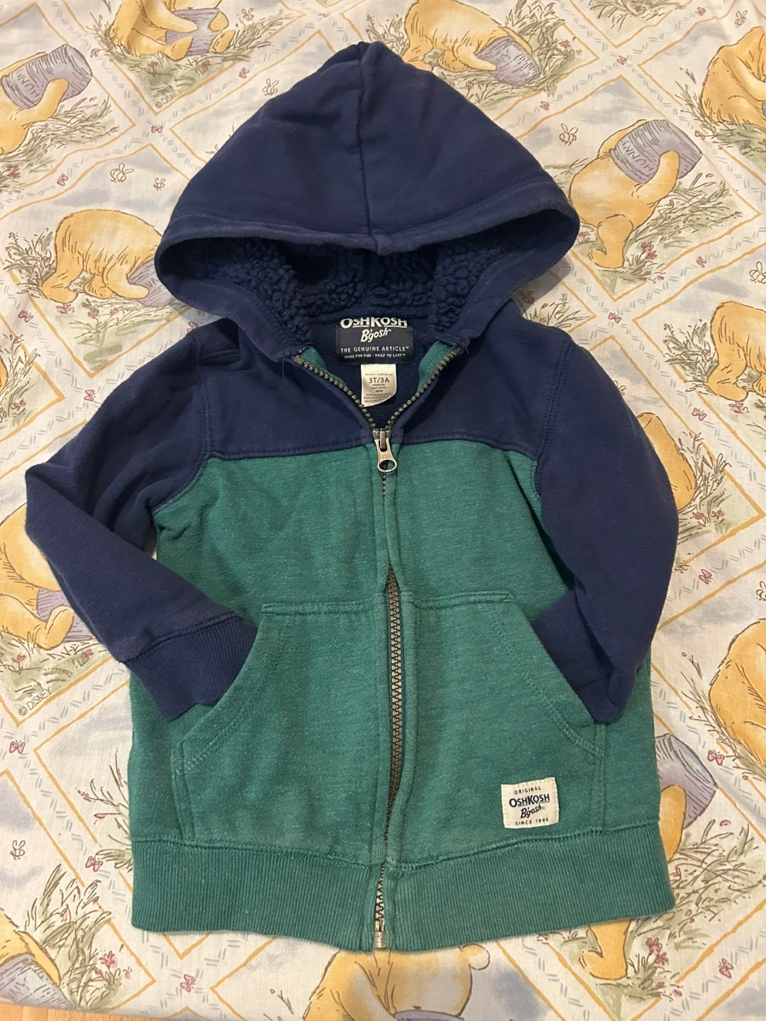 243A cute and cozy OshKosh B'gosh hoodie for your little one! This hoodie is size 3T/3A and features a stylish colour block design in blue and green. It's in great condition and ready for a new home!