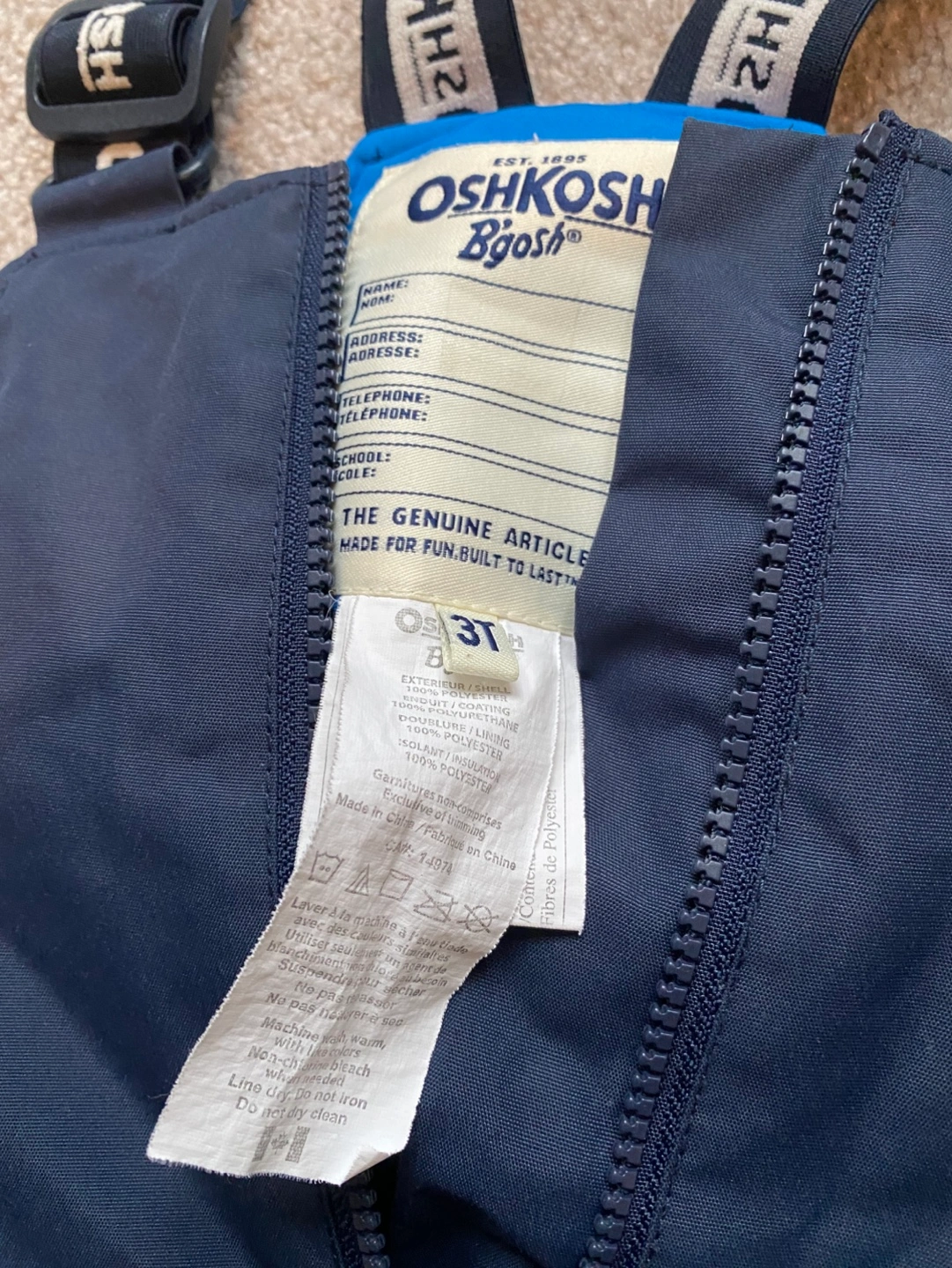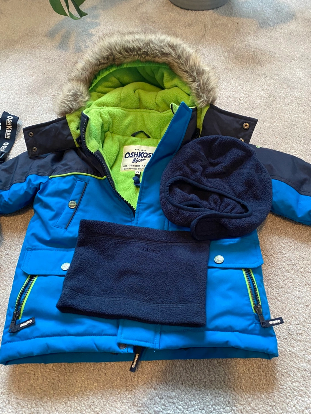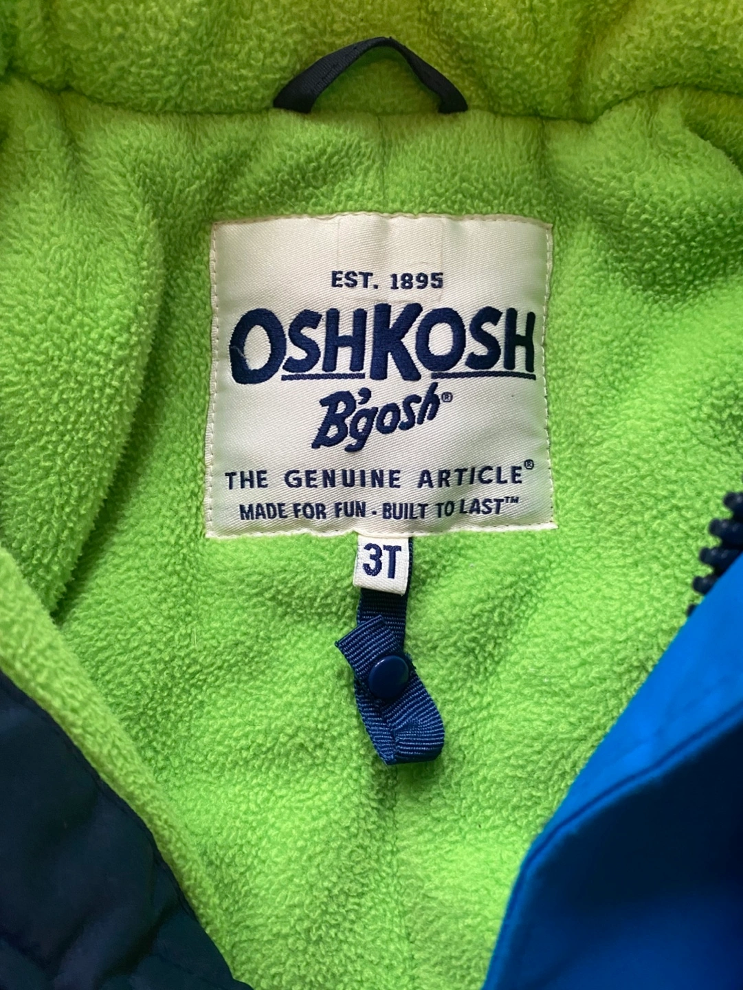 75OshKosh B'gosh snowsuit, size 3T. Includes matching hat and neck warmer. Blue, green, and navy colours. Water resistant outer shell.