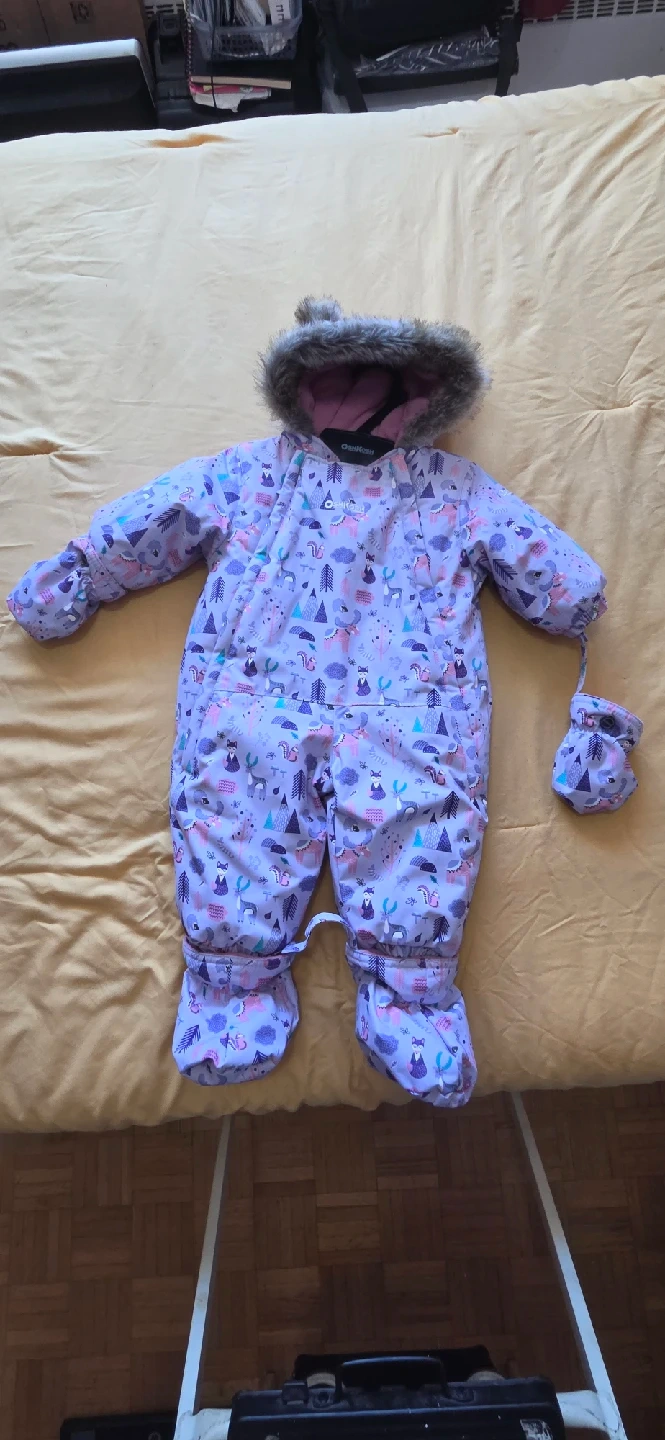 15Super cute OshKosh B'gosh snowsuit for your little one! It's size 6-9M and features a fun purple pattern with animals and trees. Comes with attached mittens to keep those tiny hands warm and cozy!