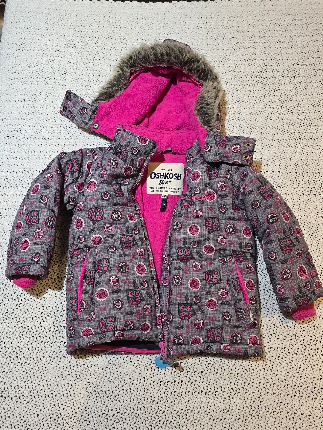 20This adorable OshKosh B'gosh puffer jacket is perfect for keeping your little one warm and cozy! It's a size 24M and features a cute owl and floral pattern in shades of grey and pink. The jacket has a soft, pink fleece lining and a faux fur-trimmed hood for extra warmth. It's in great condition and ready for a new home!