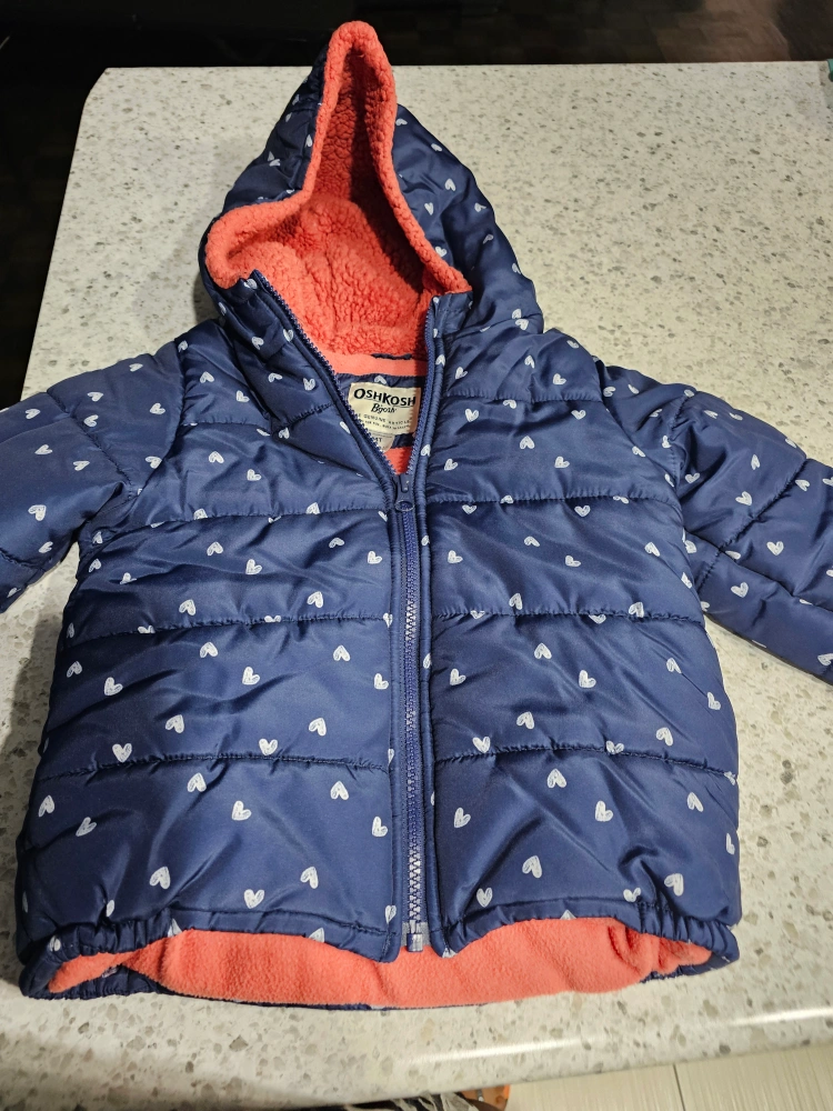 26Super cute OshKosh B'gosh puffer jacket for girls! It's a size 4T and features a navy blue exterior with a white heart pattern. The inside is lined with a soft, coral-coloured fleece, making it extra cozy for those cooler days