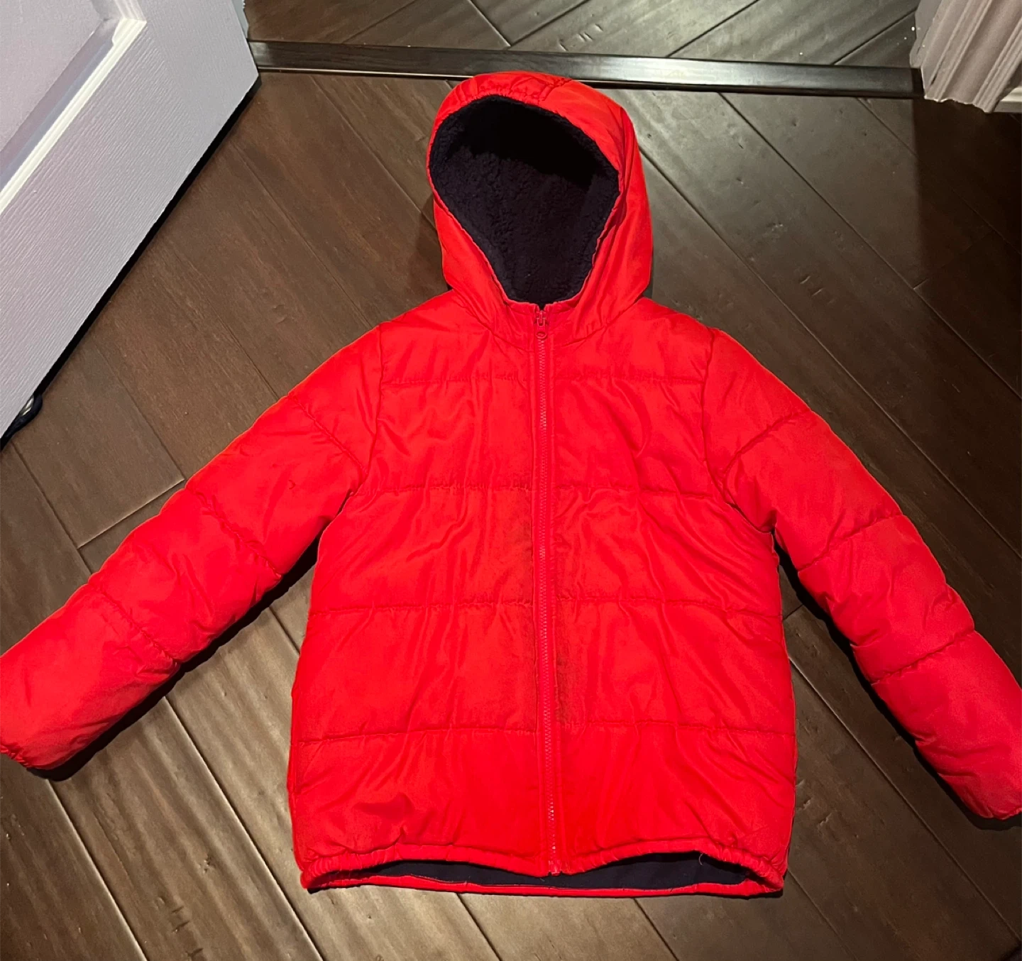 20Cozy red puffer jacket from OshKosh B'Gosh. The jacket is a size 10 and features a soft, navy blue lining.