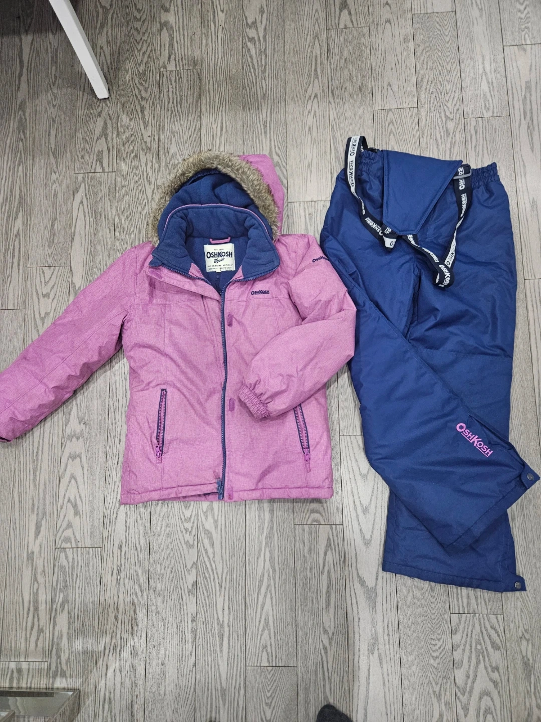 Here's a cute OshKosh B'gosh snowsuit, perfect for keeping your little one warm this winter! The set includes a pink jacket and blue snow pants. It's in great condition and ready for some snowy adventures!