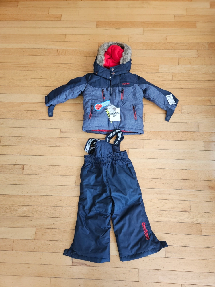 10Keep your little one warm this winter with this OshKosh B'gosh snowsuit set! The set includes a jacket with a faux fur-trimmed hood and matching snow pants with adjustable straps. Perfect for playing in the snow or just staying cozy on cold days Size 24 months