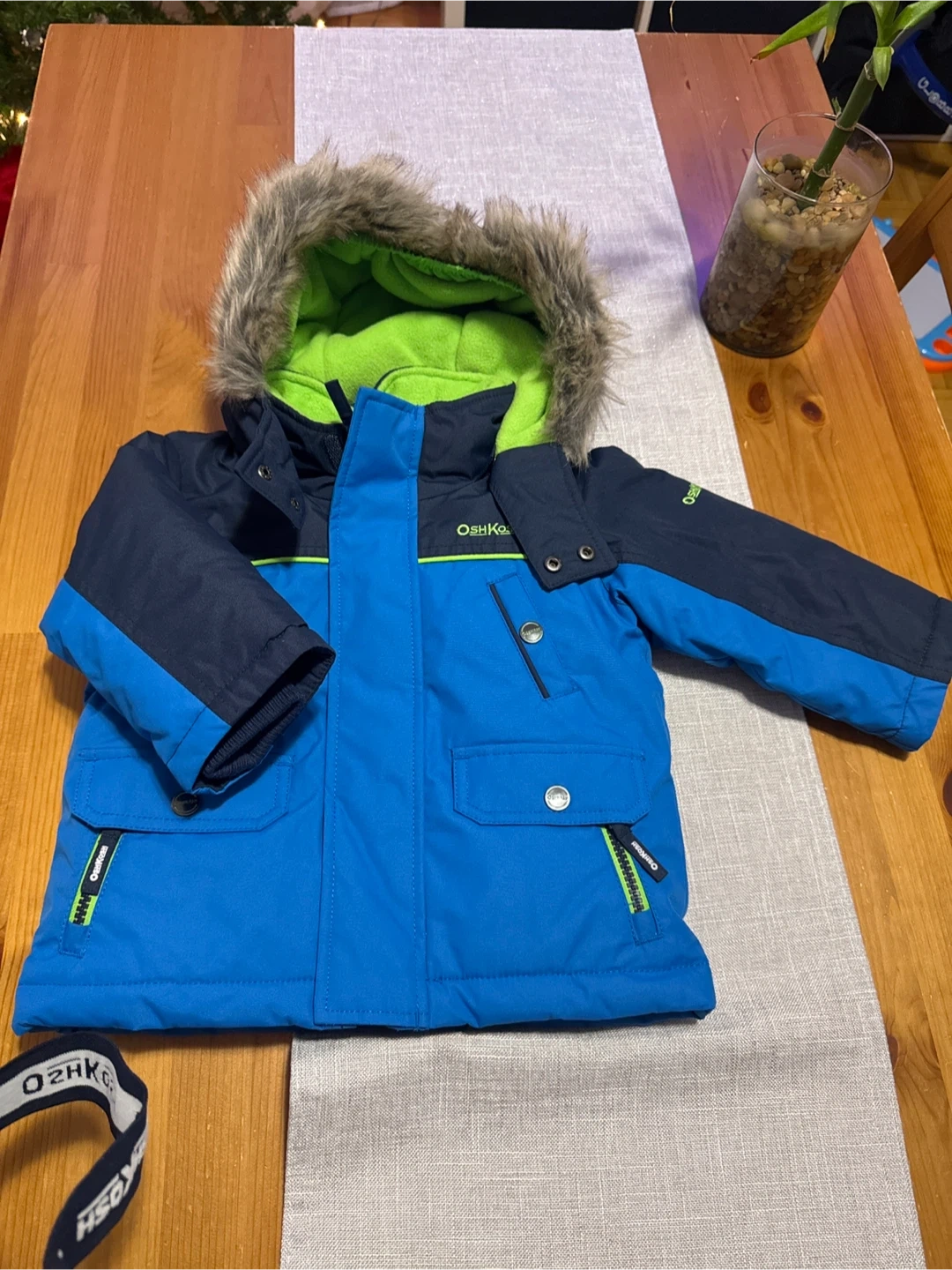 Keep your little one warm with this OshKosh B'gosh snowsuit set! It includes a blue and navy jacket with a faux fur-trimmed hood and navy snow pants with adjustable straps. Perfect for winter adventures