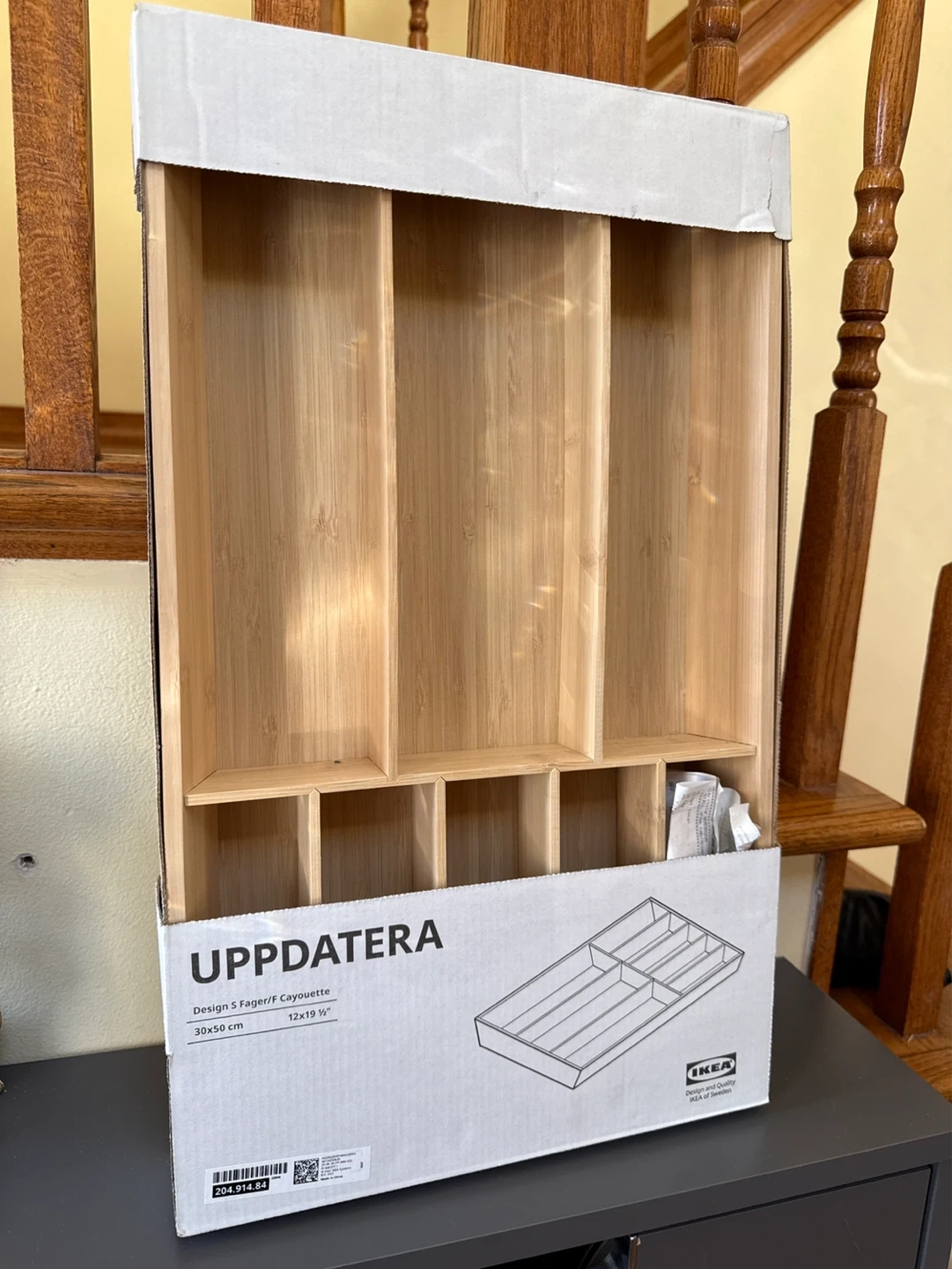This is an IKEA UPPPDATERA cutlery tray. It's made of bamboo and measures 30x50 cm. It has multiple compartments for organizing your kitchen utensils. Perfect for keeping drawers tidy!
