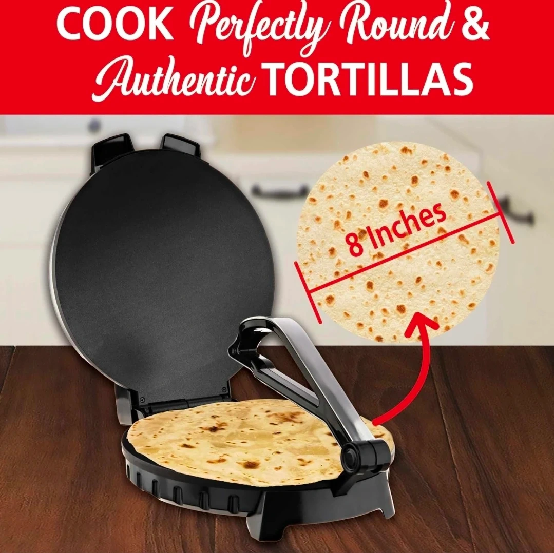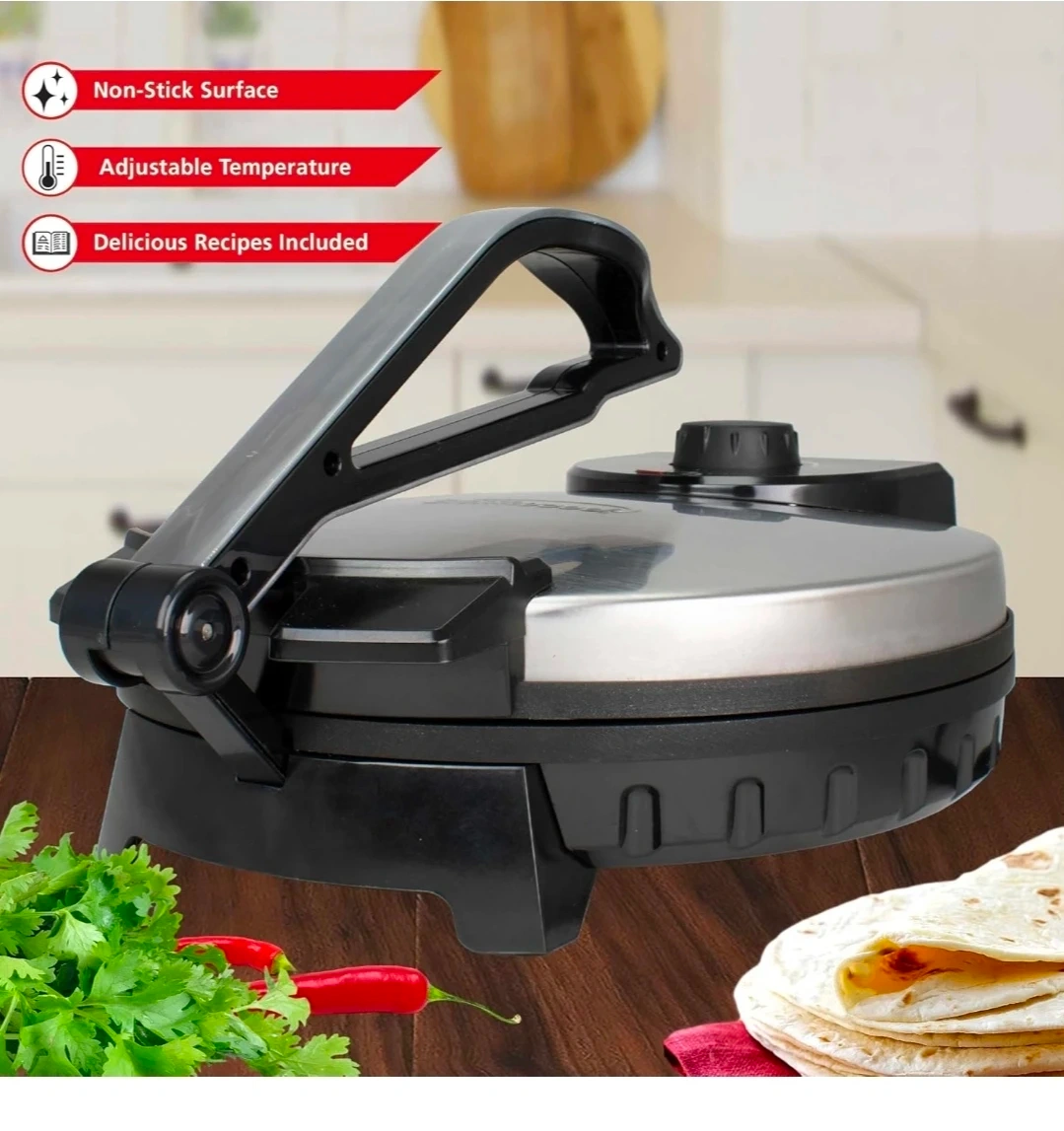 This electric tortilla maker cooks perfectly round and authentic tortillas, chapati, and roti. It features a non-stick surface and adjustable temperature for best results. Delicious recipes are also included to get you started!