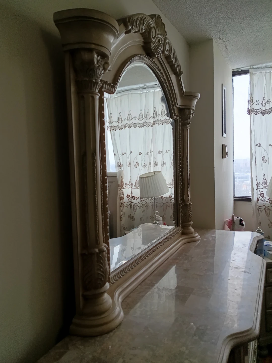 vintage-style dresser with a large, ornate mirror. It features a genuine marble top and multiple drawers. The cream-coloured finish and carved details add an elegant touch.