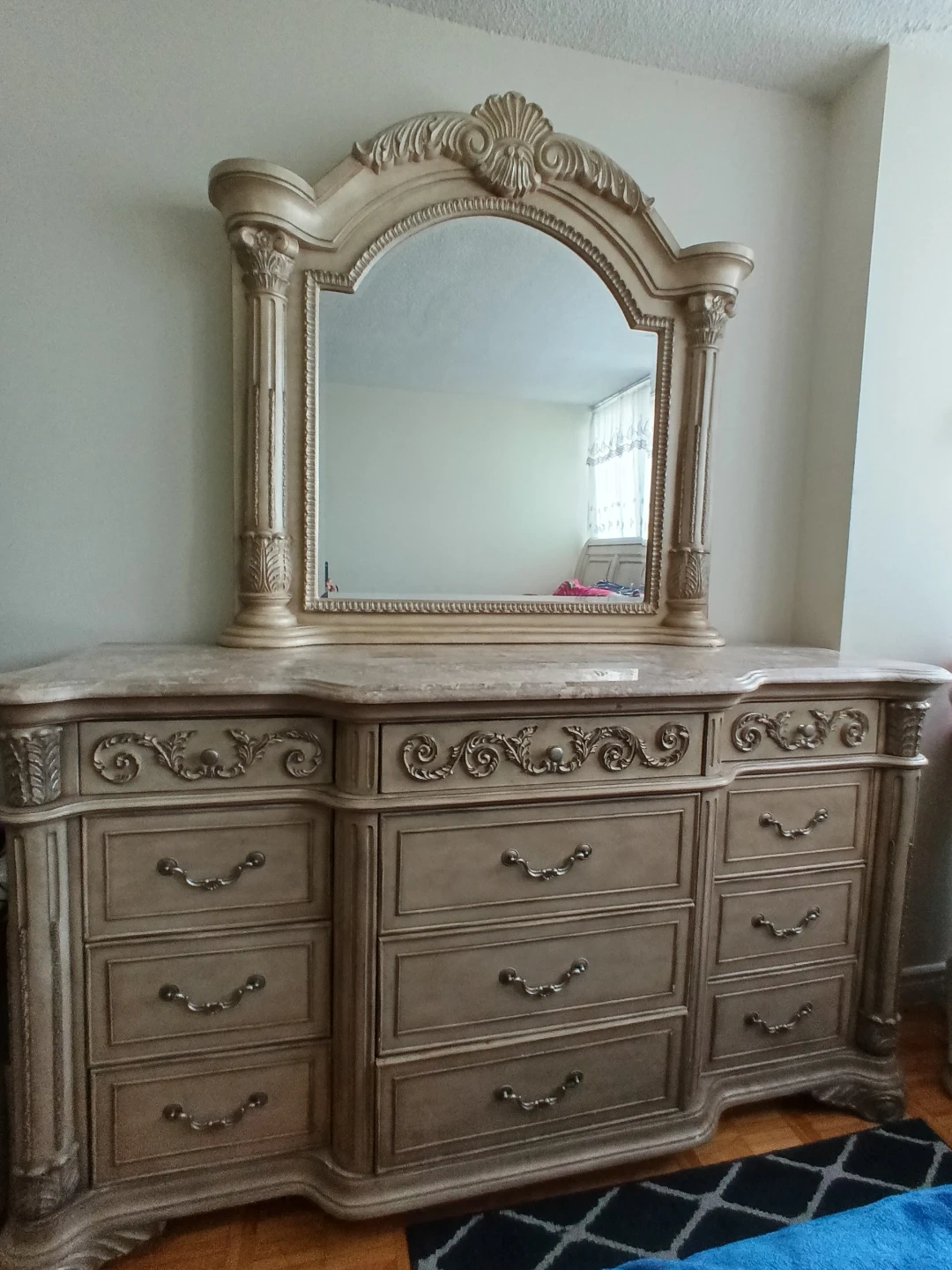 vintage-style dresser with a large, ornate mirror. It features a genuine marble top and multiple drawers. The cream-coloured finish and carved details add an elegant touch.