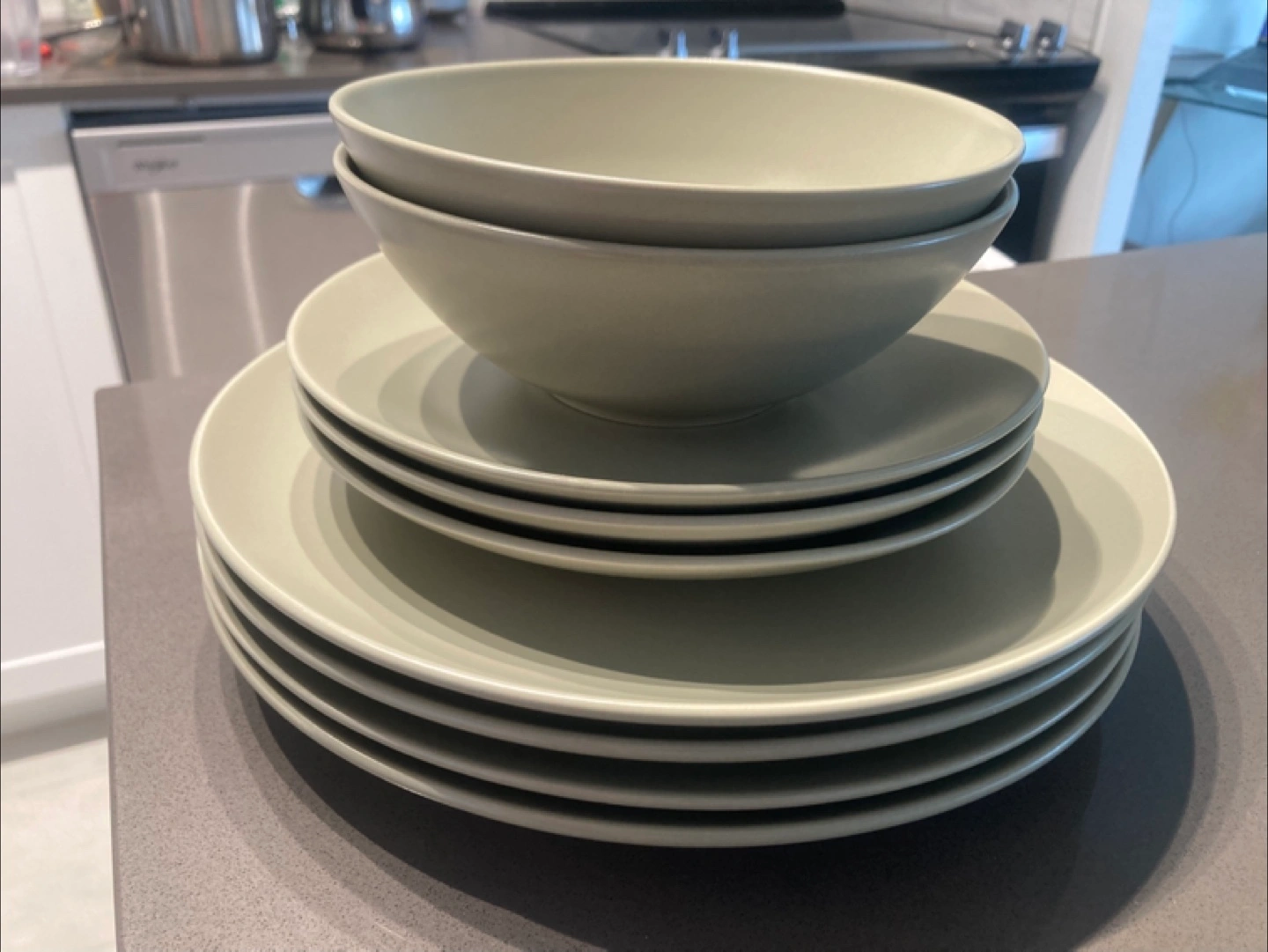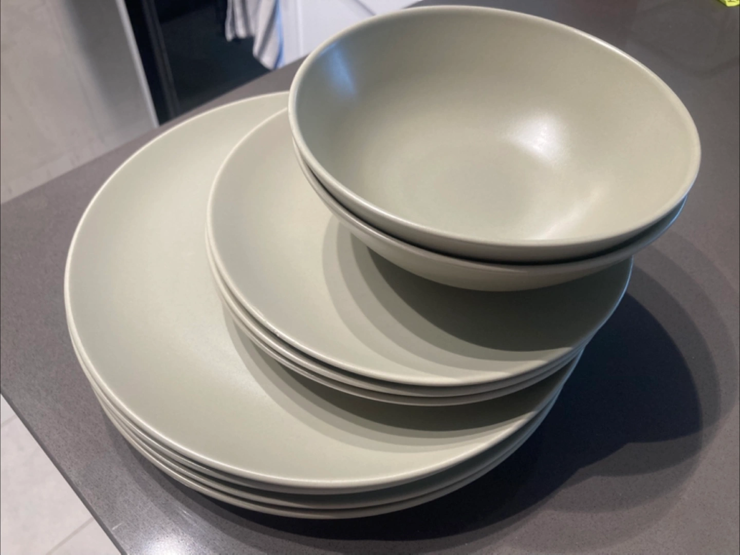 Beautiful dinnerware set, featuring a neutral colour. Plates are stacked together. Bowls are placed on top of the plates. Enjoying a home-cooked meal on this dinnerware would be a great way to relax after a long day.