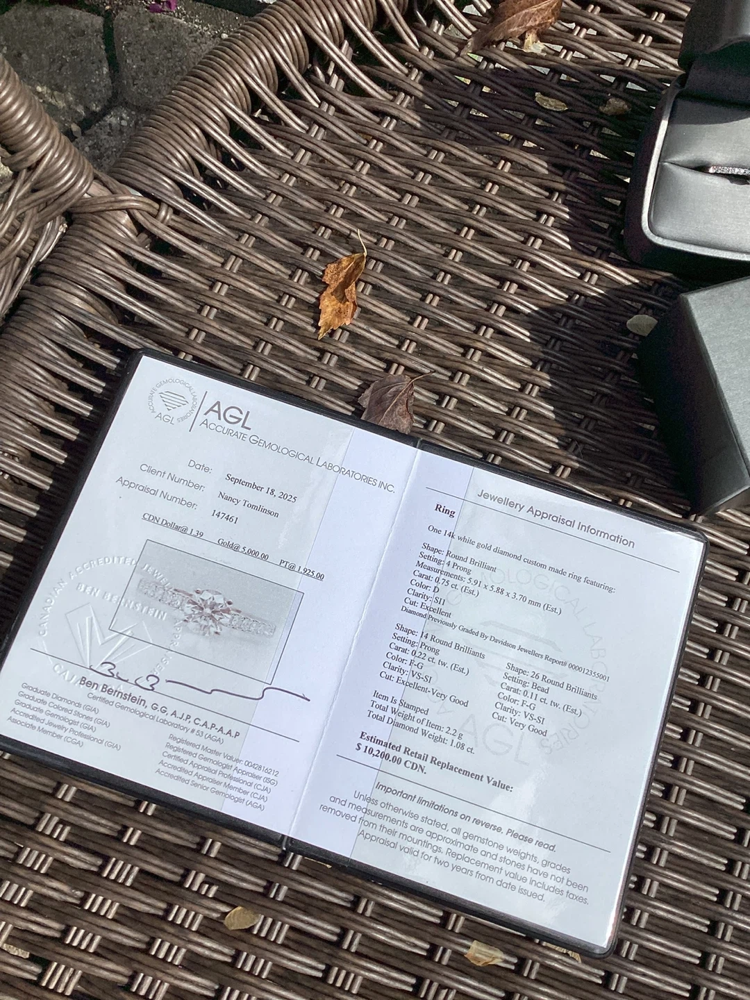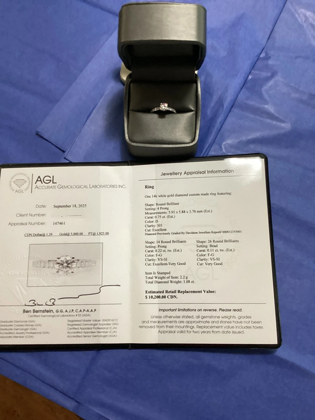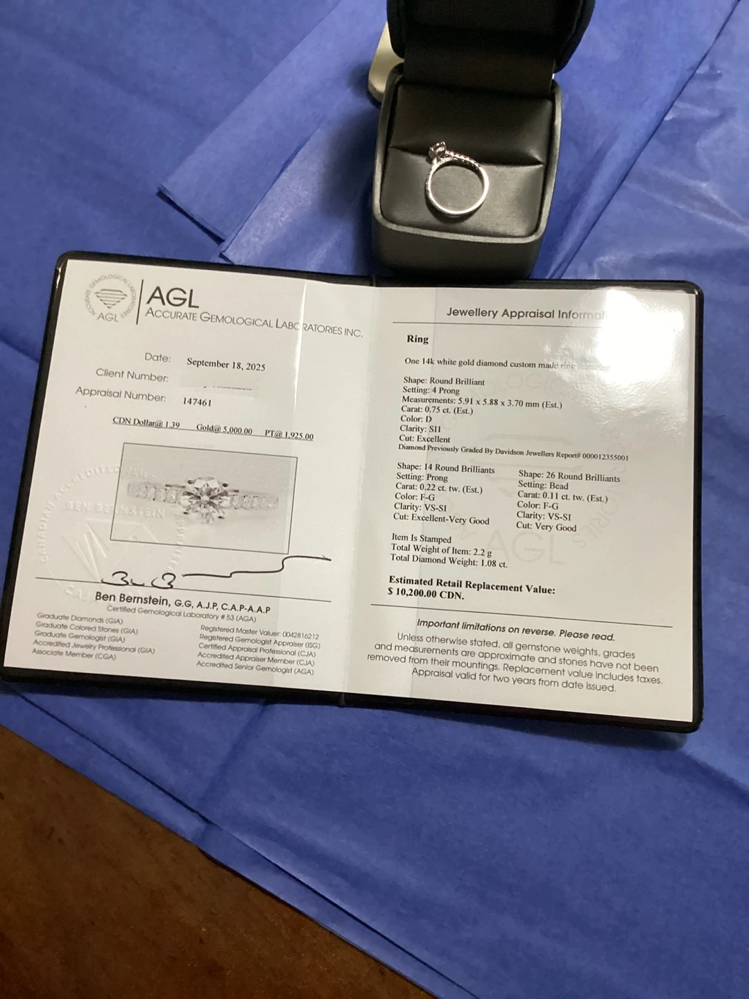 60Selling a stunning Osilawa 14k white gold diamond custom-made ring! The ring features a round brilliant shape with measurements of 5.91 x 5.88 x 3.70 mm. The carat is 0.75ct. tw. (Est.) and the clarity is SI1. D colour. The estimated retail replacement value is $10,200.00 CDN.