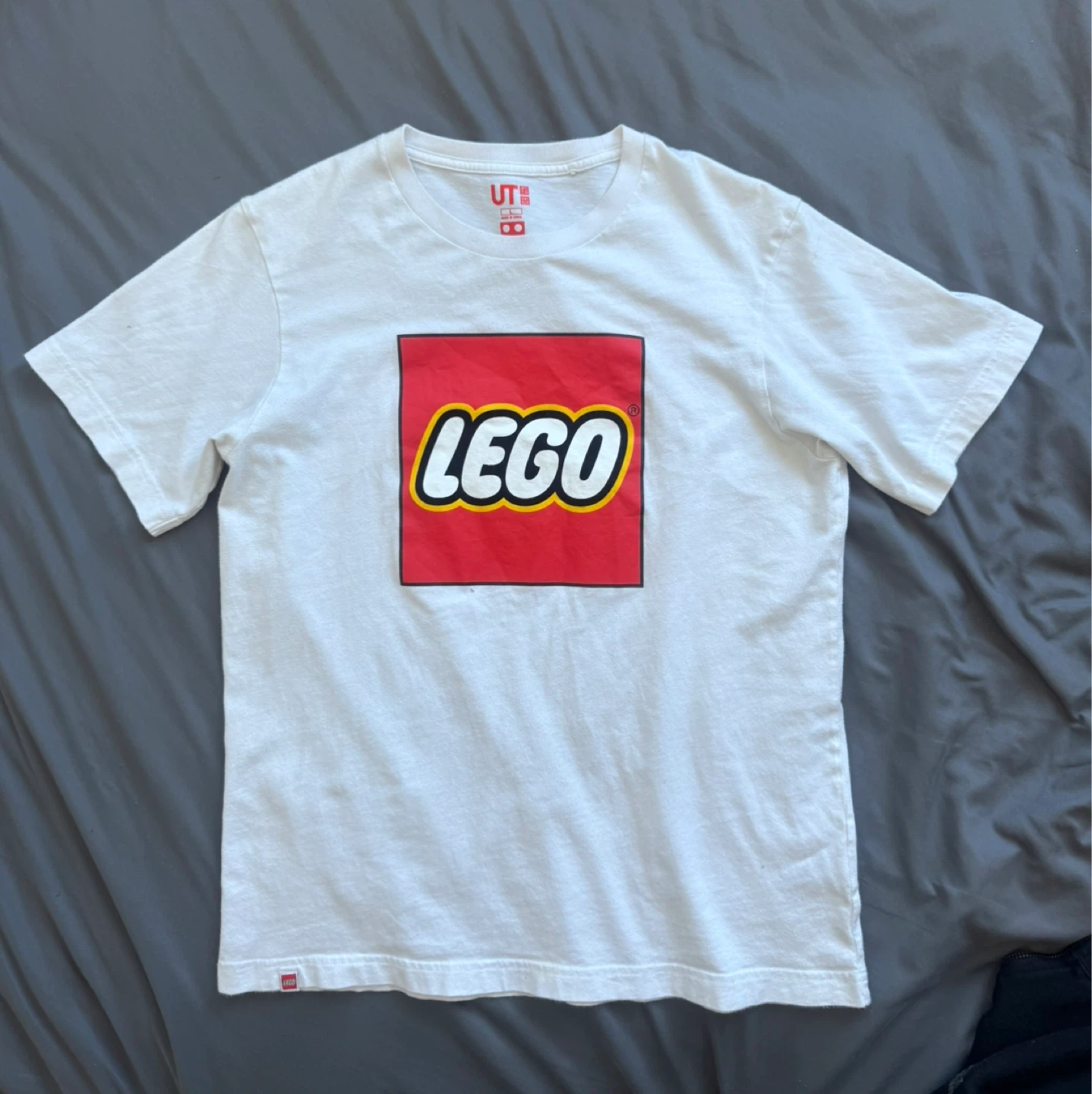 This is a white Uniqlo UT t-shirt with the classic Lego logo graphic. It's made of soft, breathable cotton for comfort. A fun shirt for Lego enthusiasts!