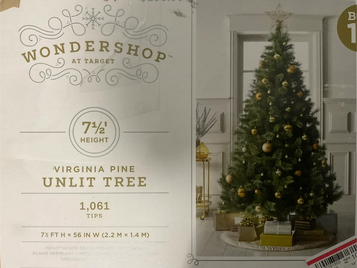 Selling a Wondershop Virginia Pine unlit Christmas tree. It stands 7 1/2 feet tall and is 56 inches wide. The tree has 1,061 tips and features pre-attached branches for easy setup. It's flame resistant and comes with a metal stand. Note that decorations are not included!