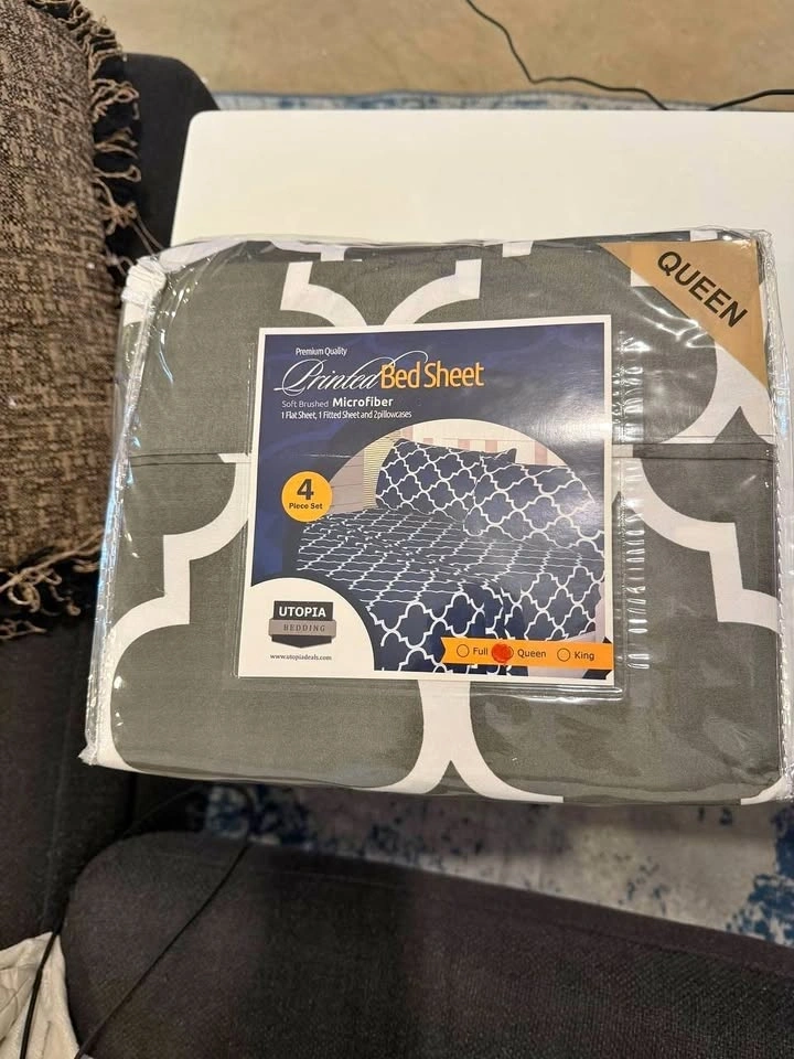 Selling a queen size bedsheet set that has never been opened. Includes 1 flat sheet, 1 fitted sheet, and 2 pillowcases. The design and grey color are shown in the pictures.