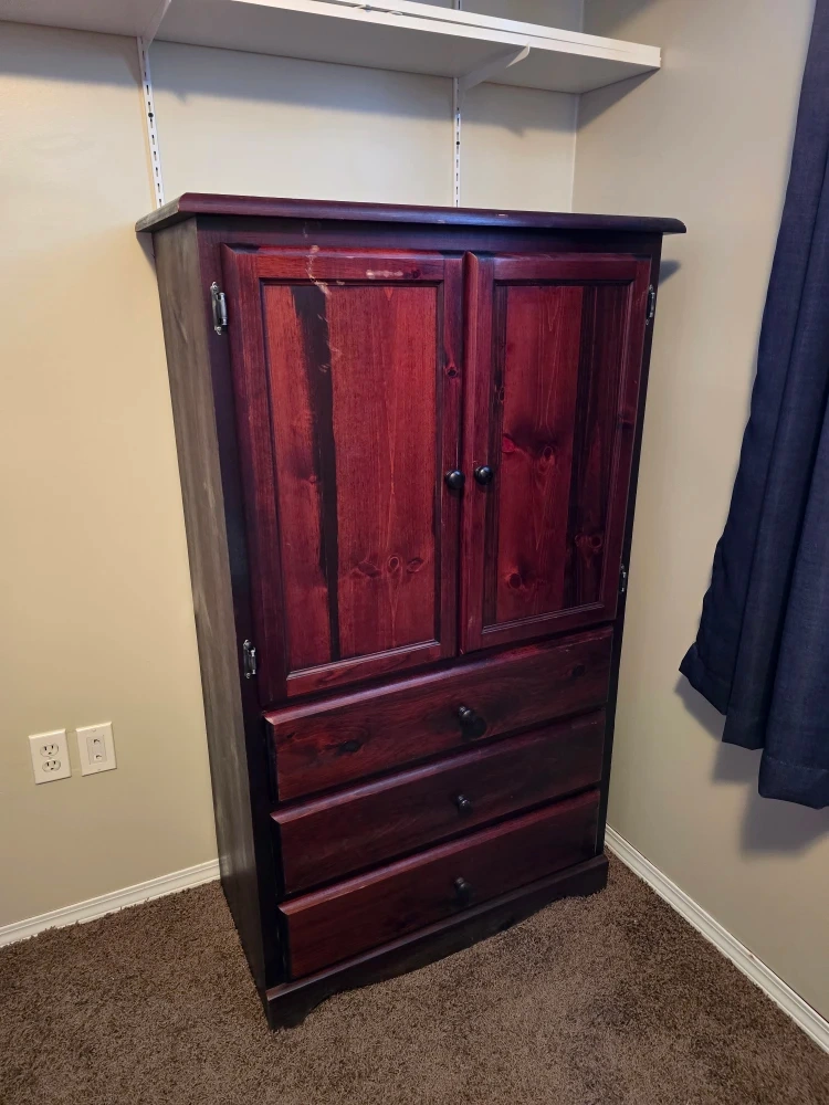Dark stained wood armoire with two doors and three drawers. It has two shelves inside the cabinet. Perfect for storage in a bedroom!