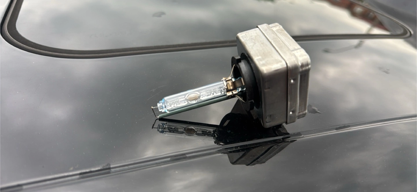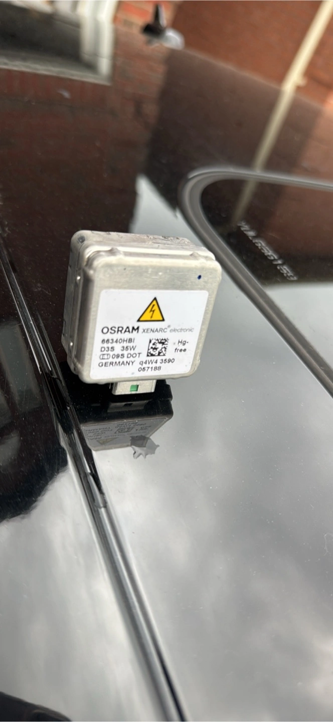 Square metallic piece. Contains some writing and a warning symbol. Connected to a bulb. You could use this to improve the visibility of your vehicle's headlights at night.