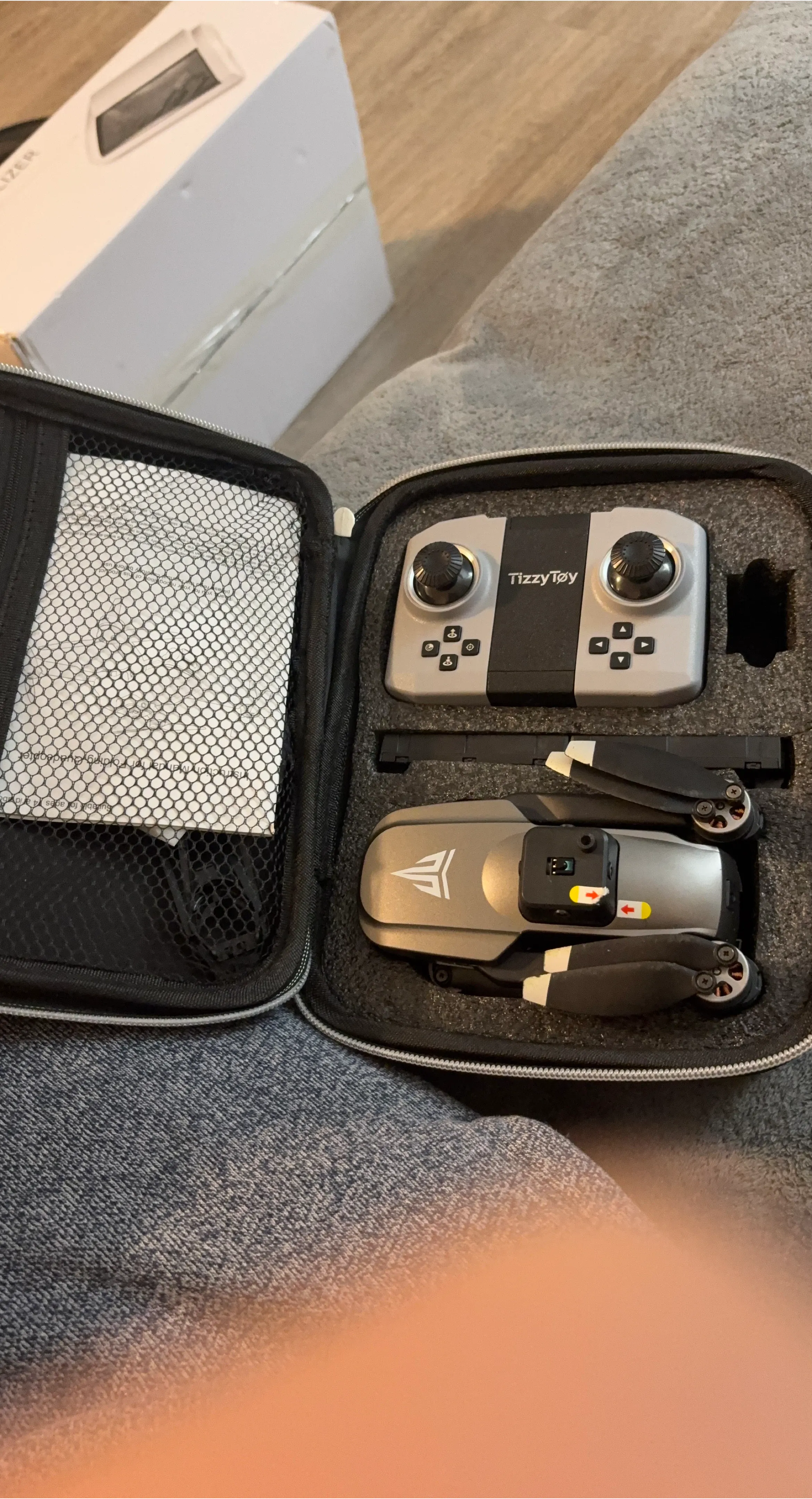 Selling a TizzyToy drone that comes with its case and remote control. The drone is in good condition and ready for some fun flights. It also includes the instructions