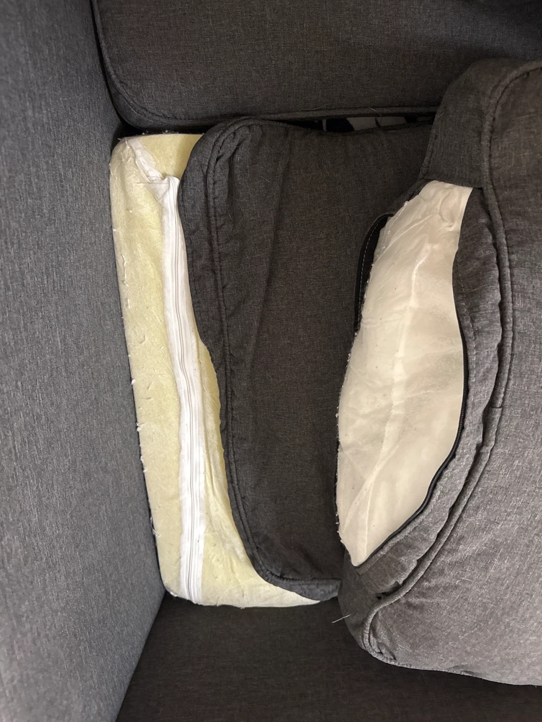 This is a dark grey, three-seater sofa. It has removable cushion covers for easy cleaning. The sofa's frame is sturdy and upholstered in a durable fabric. Spring type sofa, zipper damage.