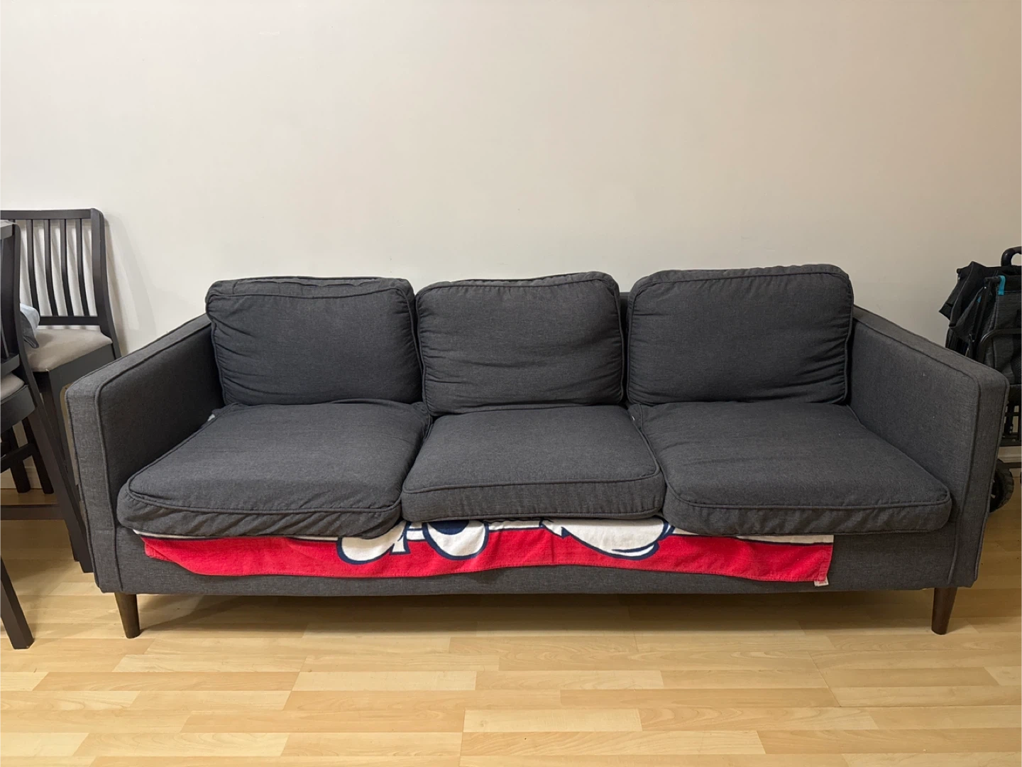 This is a dark grey, three-seater sofa. It has removable cushion covers for easy cleaning. The sofa's frame is sturdy and upholstered in a durable fabric. Spring type sofa, zipper damage.