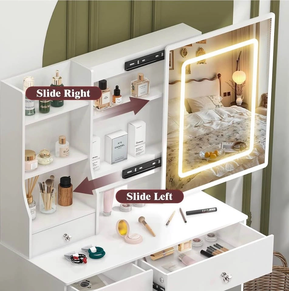 Modern Lighted Makeup Vanity with Sliding Mirror + Stool