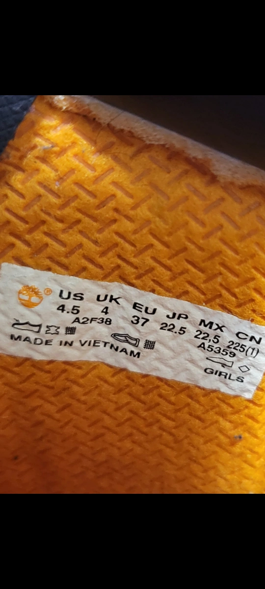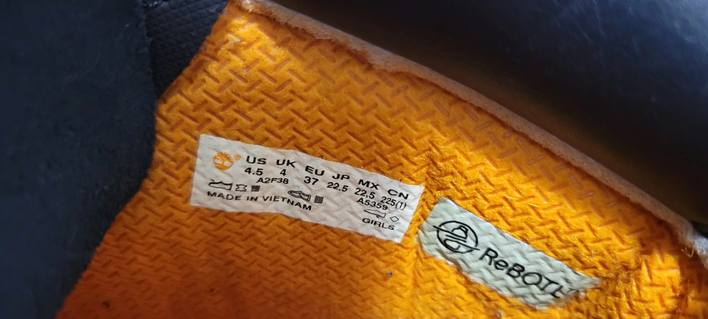 Black boots with yellow laces, size 4.5 US. Made in Vietnam.