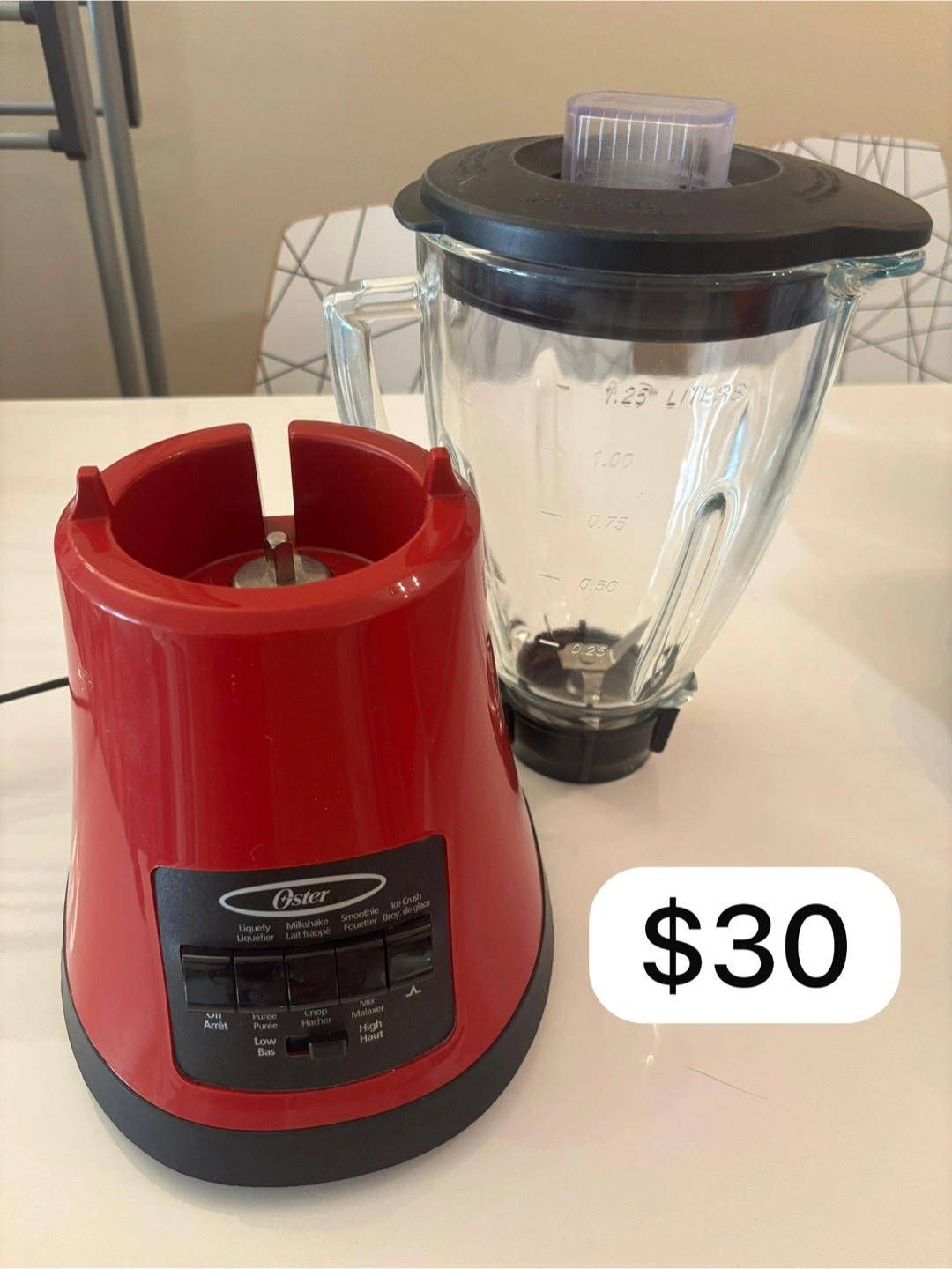 Selling a red Oster blender in good condition. It has a 1.25-liter capacity. It features settings for liquefying, making milkshakes and smoothies, and crushing ice. Asking $30