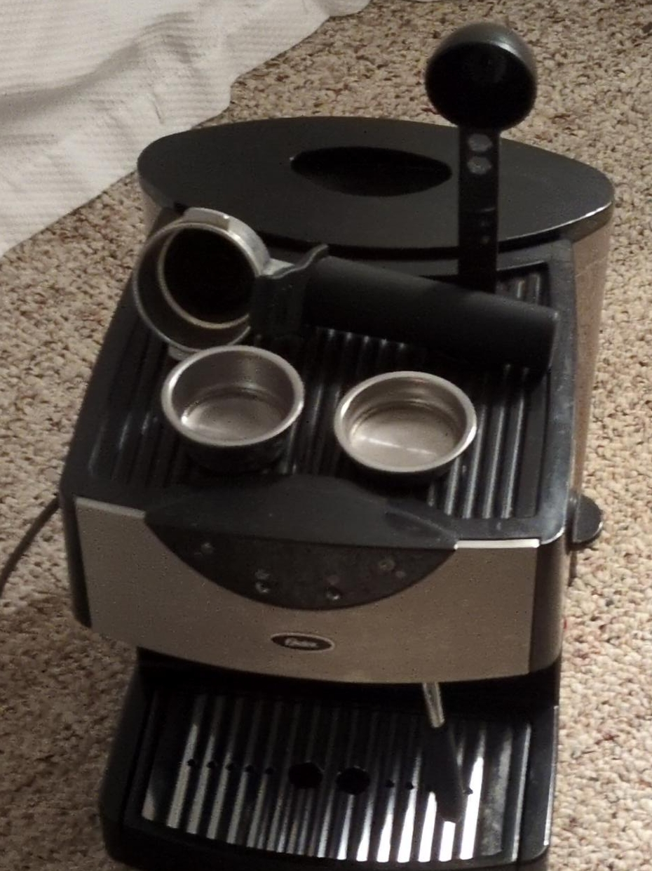 I'm selling an Oster espresso maker. It's in great shape and ready to make some delicious coffee! It comes with all the attachments you see in the photos, including the portafilter, two filter baskets, and a measuring spoon/tamper combo. Perfect for getting your caffeine fix at home