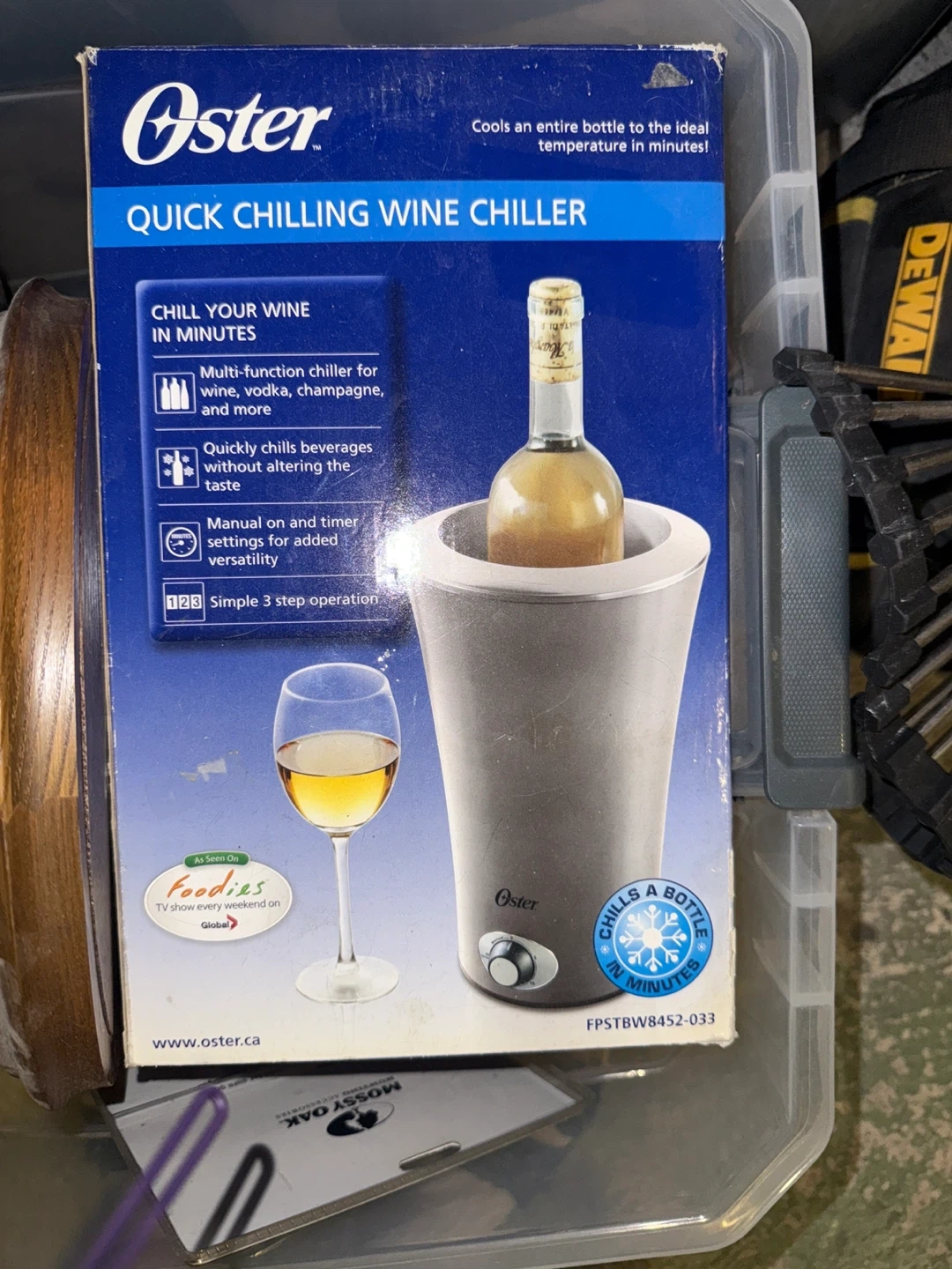 10Selling an Oster Quick Chilling Wine Chiller! It cools an entire bottle to the ideal temperature in minutes. Features: - Multi-function chiller for wine, vodka, champagne, and more - Quickly chills beverages without altering the taste - Manual on and timer settings for added versatility - Simple 3 step operation It's in great condition and comes in its original box