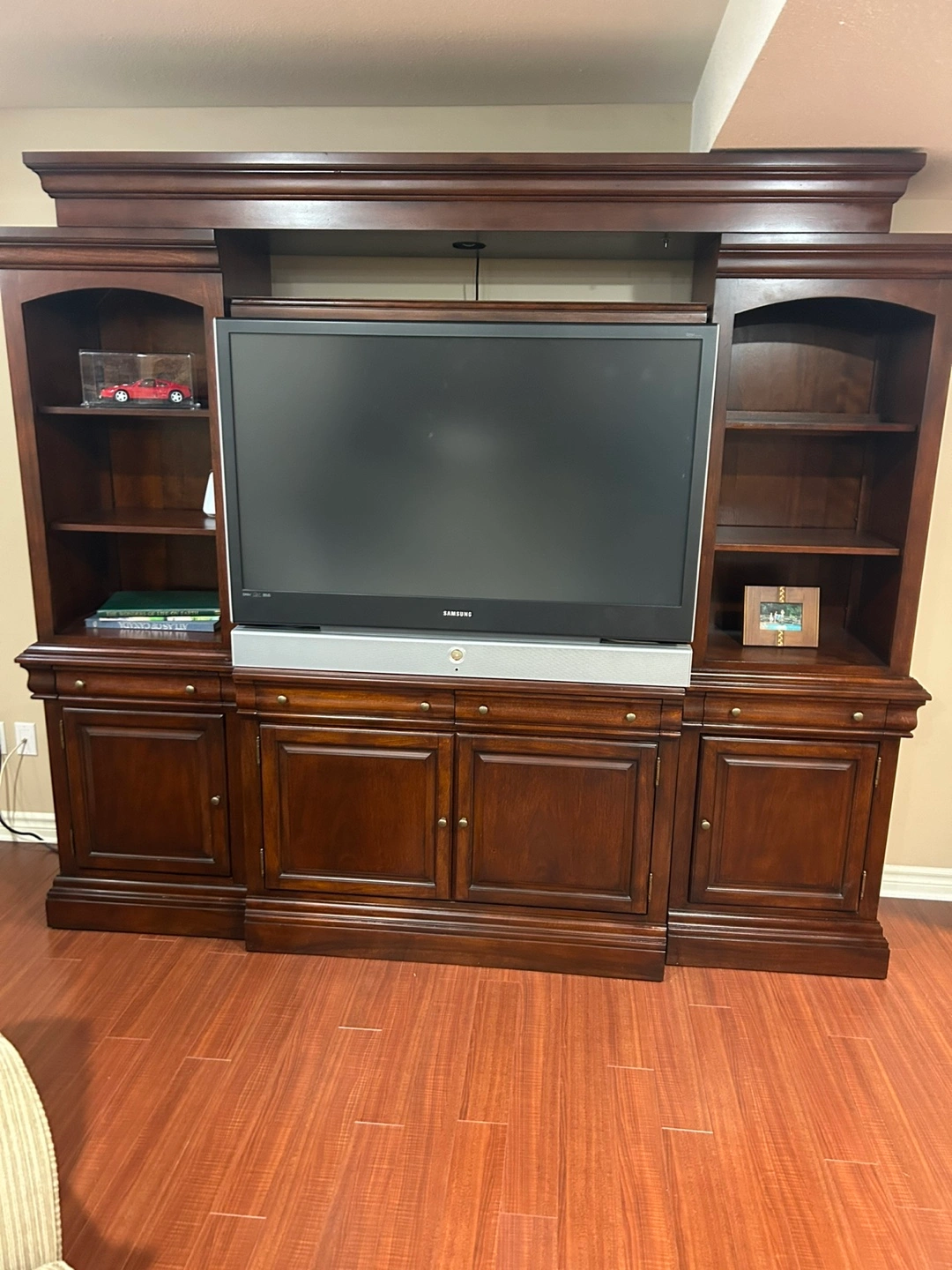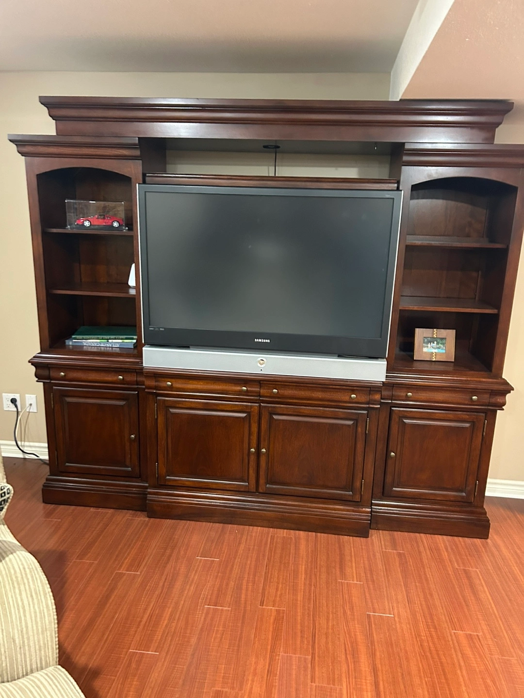 Beautiful dark brown wooden entertainment unit. Features several shelves and cabinets. Includes a large TV. Solid construction, great for a living room or family room or basement .