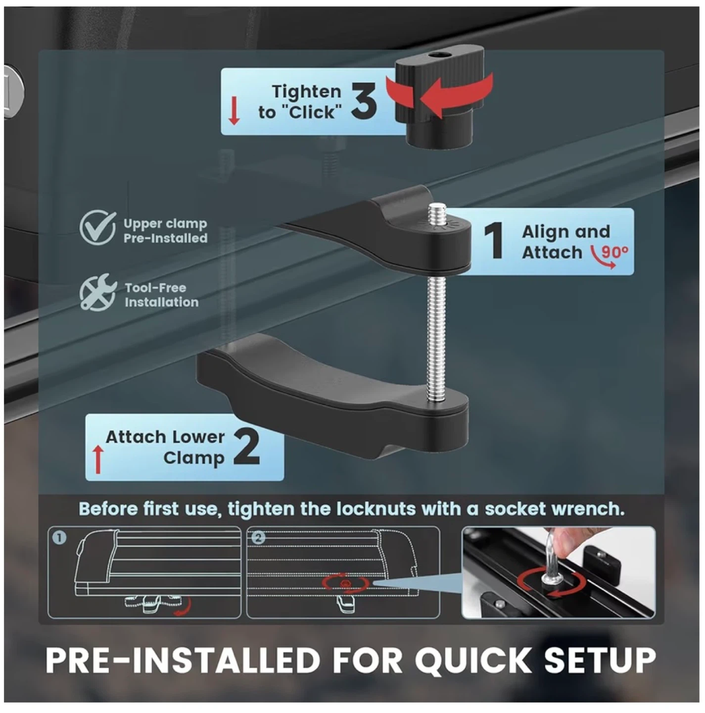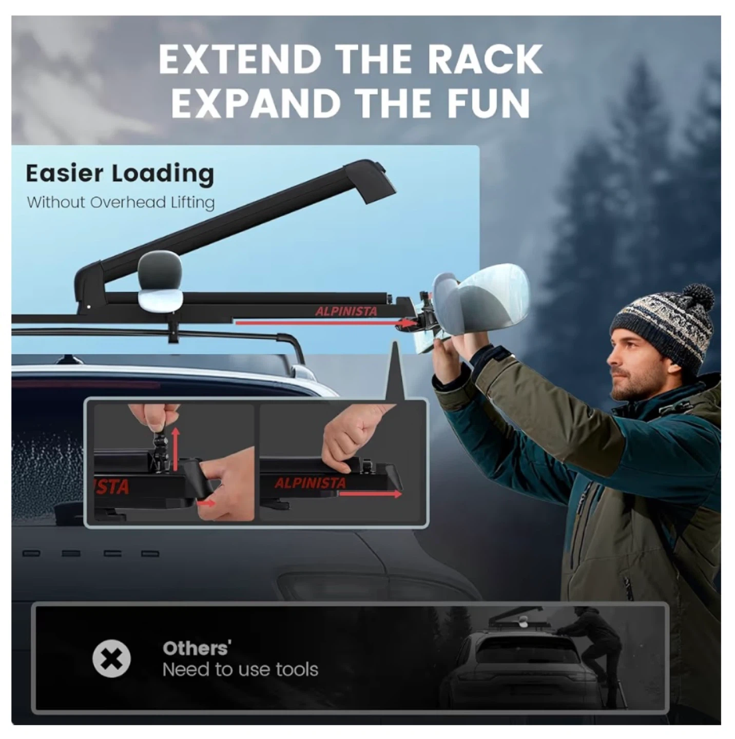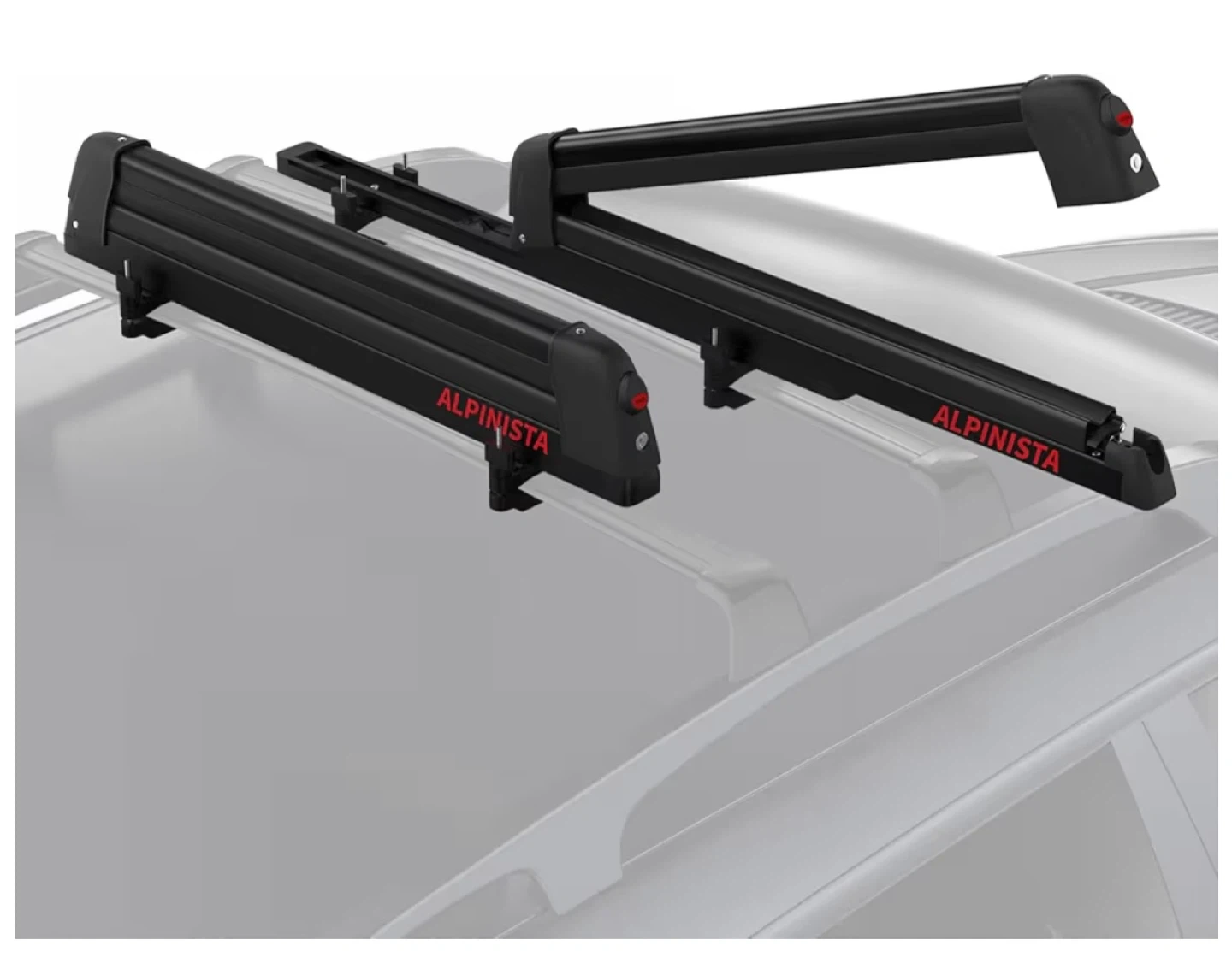 Carry up to 5 pairs of skis or 4 snowboards with this Alpinista roof rack. It features an anti-loosening threaded design and dual rubber pads for a secure, vibration-resistant grip. Tool-free installation makes setup quick and easy.
